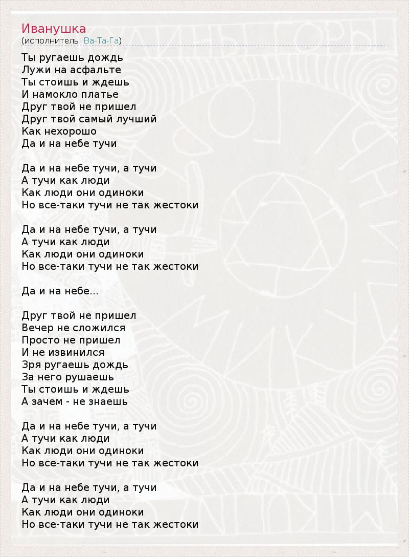 Ты ругаешь дождь Лужи на асфальте Ты стоишь и ждешь И намокло платье Друг твой не пришел Друг твой самый лучший Как нехорошо Да и на небе тучи Да и на небе тучи, а тучи А тучи как люди Как люди они одиноки Но все-таки тучи не так жестоки Да и на небе тучи, а тучи А тучи как люди Как люди они одиноки Но все-таки тучи не так жестоки Да и на небе... Друг твой не пришел Вечер не сложился Просто не пришел И не извинился Зря ругаешь дождь За него рушаешь Ты стоишь и ждешь А зачем - не знаешь Да и на небе тучи, а тучи А тучи как люди Как люди они одиноки Но все-таки тучи не так жестоки Да и на небе тучи, а тучи А тучи как люди Как люди они одиноки Но все-таки тучи не так жестоки