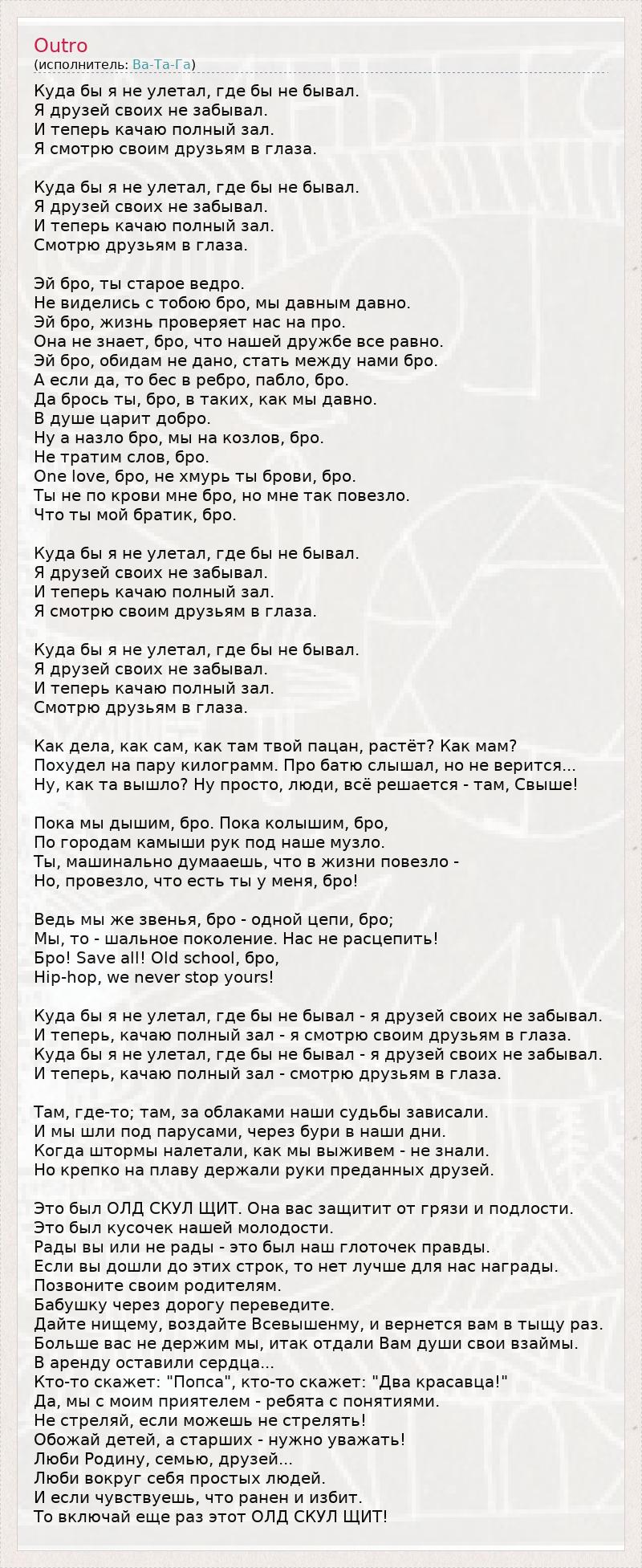 Куда бы я не улетал, где бы не бывал. Я друзей своих не забывал. И теперь качаю полный зал. Я смотрю своим друзьям в глаза. Куда бы я не улетал, где бы не бывал. Я друзей своих не забывал. И теперь качаю полный зал. Смотрю друзьям в глаза. Эй бро, ты старое ведро. Не виделись с тобою бро, мы давным давно. Эй бро, жизнь проверяет нас на про. Она не знает, бро, что нашей дружбе все равно. Эй бро, обидам не дано, стать между нами бро. А если да, то бес в ребро, пабло, бро. Да брось ты, бро, в таких, как мы давно. В душе царит добро. Ну а назло бро, мы на козлов, бро. Не тратим слов, бро. One love, бро, не хмурь ты брови, бро. Ты не по крови мне бро, но мне так повезло. Что ты мой братик, бро. Куда бы я не улетал, где бы не бывал. Я друзей своих не забывал. И теперь качаю полный зал. Я смотрю своим друзьям в глаза. Куда бы я не улетал, где бы не бывал. Я друзей своих не забывал. И теперь качаю полный зал. Смотрю друзьям в глаза. Как дела, как сам, как там твой пацан, растёт? Как мам? Похудел на пару килограмм. Про батю слышал, но не верится... Ну, как та вышло? Ну просто, люди, всё решается - там, Свыше! Пока мы дышим, бро. Пока колышим, бро, По городам камыши рук под наше музло. Ты, машинально думааешь, что в жизни повезло - Но, провезло, что есть ты у меня, бро! Ведь мы же звенья, бро - одной цепи, бро; Мы, то - шальное поколение. Нас не расцепить! Бро! Save all! Old school, бро, Hip-hop, we never stop yours! Куда бы я не улетал, где бы не бывал - я друзей своих не забывал. И теперь, качаю полный зал - я смотрю своим друзьям в глаза. Куда бы я не улетал, где бы не бывал - я друзей своих не забывал. И теперь, качаю полный зал - смотрю друзьям в глаза. Там, где-то; там, за облаками наши судьбы зависали. И мы шли под парусами, через бури в наши дни. Когда штормы налетали, как мы выживем - не знали. Но крепко на плаву держали руки преданных друзей. Это был ОЛД СКУЛ ЩИТ. Она вас защитит от грязи и подлости. Это был кусочек нашей молодости. Рады вы или не рады - это был наш глоточек правды. Если вы дошли до этих строк, то нет лучше для нас награды. Позвоните своим родителям. Бабушку через дорогу переведите. Дайте нищему, воздайте Всевышенму, и вернется вам в тыщу раз. Больше вас не держим мы, итак отдали Вам души свои взаймы. В аренду оставили сердца... Кто-то скажет: "Попса", кто-то скажет: "Два красавца!" Да, мы с моим приятелем - ребята с понятиями. Не стреляй, если можешь не стрелять! Обожай детей, а старших - нужно уважать! Люби Родину, семью, друзей... Люби вокруг себя простых людей. И если чувствуешь, что ранен и избит. То включай еще раз этот ОЛД СКУЛ ЩИТ!