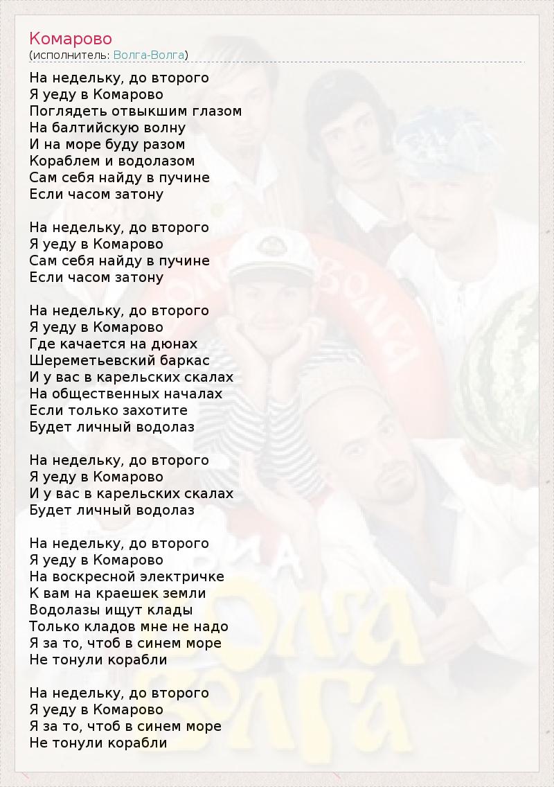 На недельку, до второго Я уеду в Комарово Поглядеть отвыкшим глазом На балтийскую волну И на море буду разом Кораблем и водолазом Сам себя найду в пучине Если часом затону На недельку, до второго Я уеду в Комарово Сам себя найду в пучине Если часом затону На недельку, до второго Я уеду в Комарово Где качается на дюнах Шереметьевский баркас И у вас в карельских скалах На общественных началах Если только захотите Будет личный водолаз На недельку, до второго Я уеду в Комарово И у вас в карельских скалах Будет личный водолаз На недельку, до второго Я уеду в Комарово На воскресной электричке К вам на краешек земли Водолазы ищут клады Только кладов мне не надо Я за то, чтоб в синем море Не тонули корабли На недельку, до второго Я уеду в Комарово Я за то, чтоб в синем море Не тонули корабли