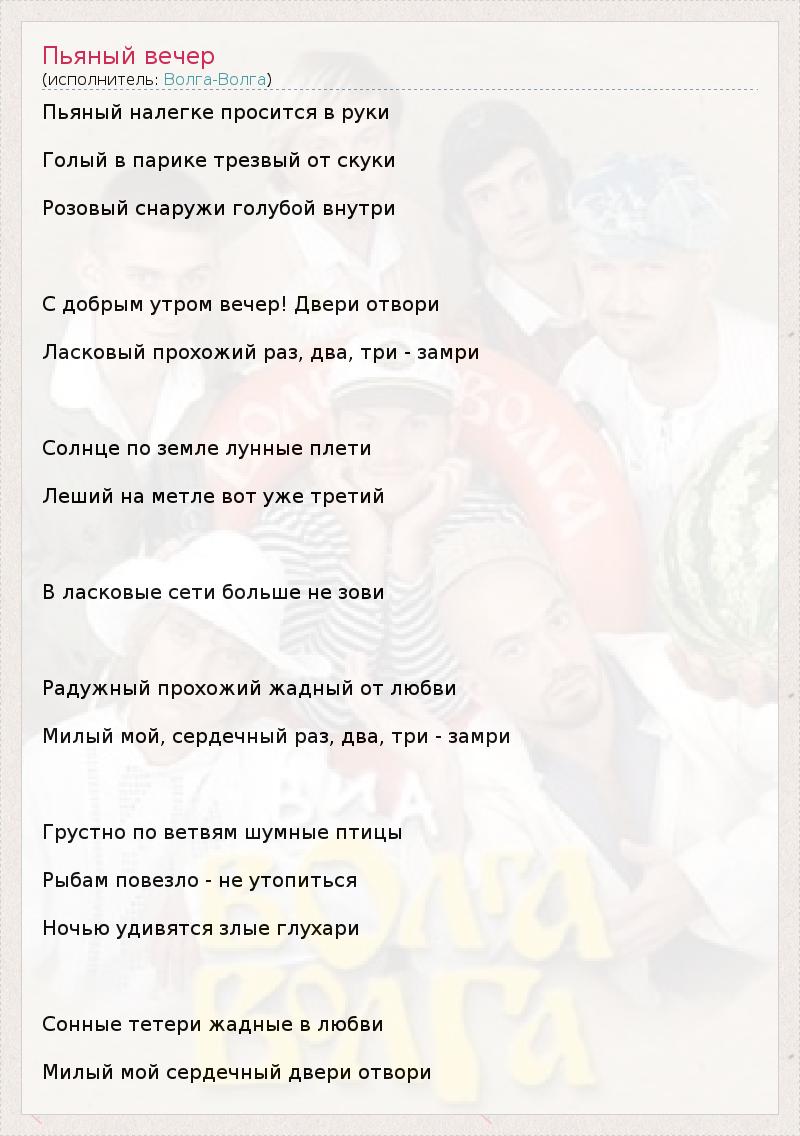 Пьяный налегке просится в руки Голый в парике трезвый от скуки Розовый снаружи голубой внутри С добрым утром вечер! Двери отвори Ласковый прохожий раз, два, три - замри Солнце по земле лунные плети Леший на метле вот уже третий В ласковые сети больше не зови Радужный прохожий жадный от любви Милый мой, сердечный раз, два, три - замри Грустно по ветвям шумные птицы Рыбам повезло - не утопиться Ночью удивятся злые глухари Сонные тетери жадные в любви Милый мой сердечный двери отвори