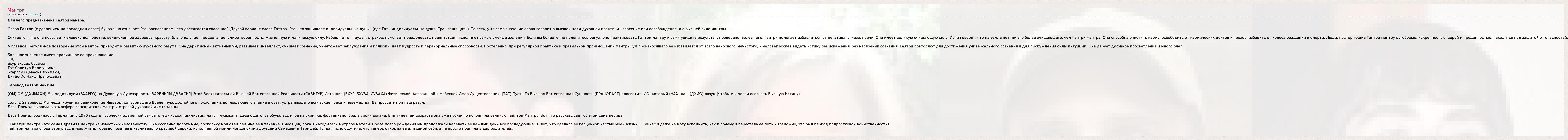 Для чего предназначена Гаятри мантра. Слово Гаятри (с ударением на последнем слоге) буквально означает "то, воспеванием чего достигается спасение". Другой вариант слова Гаятра- "то, что защищает индивидуальные души" (где Гая - индивидуальные души, Тра - защищать). То есть, уже само значение слова говорит о высшей цели духовной практики - спасение или освобождение, и о высшей силе мантры. Считается, что она посылает человеку долголетие, великолепное здоровье, красоту, благополучие, процветание, умиротворенность, жизненную и магическую силу. Избавляет от неудач, страхов, помогает преодолевать препятствия, исполняет самые смелые желания. Если вы болеете, не поленитесь регулярно практиковать Гаятри мантру и сами увидите результат, проверено. Более того, Гаятри помогает избавляться от негатива, сглаза, порчи. Она имеет великую очищающую силу. Йоги говорят, что на земле нет ничего более очищающего, чем Гаятри мантра. Она способна очистить карму, освободить от кармических долгов и грехов, избавить от колеса рождения и смерти. Люди, повторяющие Гаятри мантру с любовью, искренностью, верой и преданностью, находятся под защитой от опасностей. А главное, регулярное повторение этой мантры приводит к развитию духовного разума. Она дарит ясный активный ум, развивает интеллект, очищает сознание, уничтожает заблуждения и иллюзии, дает мудрость и паранормальные способности. Постепенно, при регулярной практике и правильном произношении мантры, ум произносящего ее избавляется от всего наносного, нечистого, и человек может видеть истину без искажения, без наслоений сознания. Гаятри повторяют для достижения универсального сознания и для пробуждения силы интуиции. Она дарует духовное просветление и много благ. Большое значение имеет правильное ее произношение: Ом; Бхур Бхувах Сува-ха; Тат Савитур Варе-уньям; Бхарго-О Девасья Дхимахи; Дхийо-Йо Нахф Прачо-дайат. Перевод Гаятри мантры: (ОМ) ОМ (ДХИМАХИ) Мы медитируем (БХАРГО) на Духовную Лучезарность (ВАРЕНЬЯМ ДЭВАСЬЯ) Этой Восхитительной Высшей Божественной Реальности (САВИТУР) Источник (БХУР, БХУВА, СУВАХА) Физической, Астральной и Небесной Сфер Существования. (ТАТ) Пусть Та Высшая Божественная Сущность (ПРАЧОДАЯТ) просветит (ЙО) который (НАХ) наш (ДХЙО) разум (чтобы мы могли осознать Высшую Истину). вольный перевод: Мы медитируем на великолепие Ишвары, сотворившего Вселенную, достойного поклонения, воплощающего знание и свет, устраняющего всяческие грехи и невежества. Да просветит он наш разум. Дэва Премал выросла в атмосфере санскритских мантр и строгой духовной дисциплины. Дэва Премал родилась в Германии в 1970 году в творчески одаренной семье: отец - художник-мистик, мать – музыкант. Дэва с детства обучалась игре на скрипке, фортепиано, брала уроки вокала. В пятилетнем возрасте она уже публично исполняла великую Гайятри Мантру. Вот что рассказывает об этом сама певица: «Гайатри мантра - это самая древняя мантра из известных человечеству. Она особенно дорога мне, поскольку мой отец пел мне ее в течение 9 месяцев, пока я находилась в утробе матери. После моего рождения мы продолжали напевать ее каждый день все последующие 10 лет, что сделало ее бесценной частью моей жизни… Сейчас я даже не могу вспомнить, как и почему я перестала ее петь – возможно, это был период подростковой воинственности! Гайятри мант