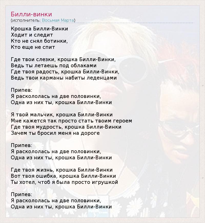 Крошка Билли-Винки Ходит и следит Кто не снял ботинки, Кто еще не спит Где твои слезки, крошка Билли-Винки, Ведь ты летаешь под облаками Где твоя радость, крошка Билли-Винки, Ведь твои карманы набиты леденцами Припев: Я раскололась на две половинки, Одна из них ты, крошка Билли-Винки Я твой мальчик, крошка Билли-Винки Мне кажется так просто стать твоим героем Где твоя мудрость, крошка Билли-Винки Зачем ты бросил меня на дороге Припев: Я раскололась на две половинки, Одна из них ты, крошка Билли-Винки Где твоя жизнь, крошка Билли-Винки Вот твоя ошибка, крошка Билли-Винки Ты хотел, чтоб я была просто игрушкой Припев: Я раскололась на две половинки, Одна из них ты, крошка Билли-Винки