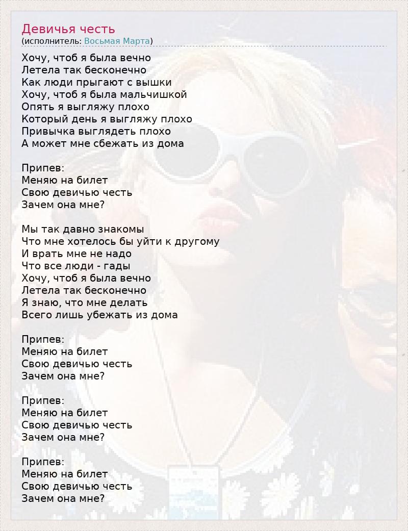Хочу, чтоб я была вечно Летела так бесконечно Как люди прыгают с вышки Хочу, чтоб я была мальчишкой Опять я выгляжу плохо Который день я выгляжу плохо Привычка выглядеть плохо А может мне сбежать из дома Припев: Меняю на билет Свою девичью честь Зачем она мне? Мы так давно знакомы Что мне хотелось бы уйти к другому И врать мне не надо Что все люди - гады Хочу, чтоб я была вечно Летела так бесконечно Я знаю, что мне делать Всего лишь убежать из дома Припев: Меняю на билет Свою девичью честь Зачем она мне? Припев: Меняю на билет Свою девичью честь Зачем она мне? Припев: Меняю на билет Свою девичью честь Зачем она мне?