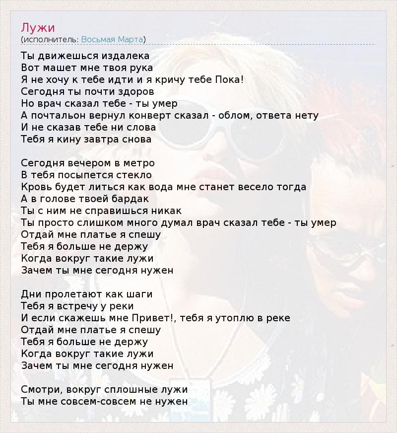 Ты движешься издалека Вот машет мне твоя рука Я не хочу к тебе идти и я кричу тебе Пока! Сегодня ты почти здоров Hо врач сказал тебе - ты умер А почтальон вернул конверт сказал - облом, ответа нету И не сказав тебе ни слова Тебя я кину завтра снова Сегодня вечером в метро В тебя посыпется стекло Кровь будет литься как вода мне станет весело тогда А в голове твоей бардак Ты с ним не справишься никак Ты просто слишком много думал врач сказал тебе - ты умер Отдай мне платье я спешу Тебя я больше не держу Когда вокруг такие лужи Зачем ты мне сегодня нужен Дни пролетают как шаги Тебя я встречу у реки И если скажешь мне Привет!, тебя я утоплю в реке Отдай мне платье я спешу Тебя я больше не держу Когда вокруг такие лужи Зачем ты мне сегодня нужен Смотри, вокруг сплошные лужи Ты мне совсем-совсем не нужен