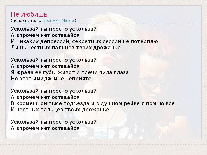 Ускользай ты просто ускользай А впрочем нет оставайся И никаких депрессий, секретных сессий не потерплю Лишь честных пальцев твоих дрожанье Ускользай ты просто ускользай А впрочем нет оставайся Я жрала ее губы живот и плечи пила глаза Hо этот имидж мне неприятен Ускользай ты просто ускользай А впрочем нет оставайся В кромешной тьме подъезда и в душном рейве я помню все И честных пальцев твоих дрожанье Ускользай ты просто ускользай А впрочем нет оставайся
