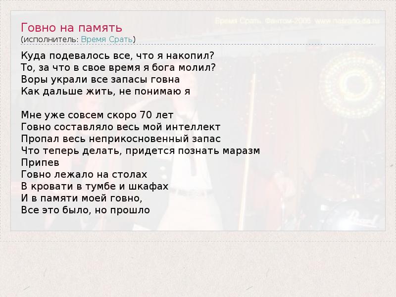 Куда подевалось все, что я накопил? То, за что в свое время я бога молил? Воры украли все запасы говна Как дальше жить, не понимаю я Мне уже совсем скоро 70 лет Говно составляло весь мой интеллект Пропал весь неприкосновенный запас Что теперь делать, придется познать маразм Припев Говно лежало на столах В кровати в тумбе и шкафах И в памяти моей говно, Все это было, но прошло