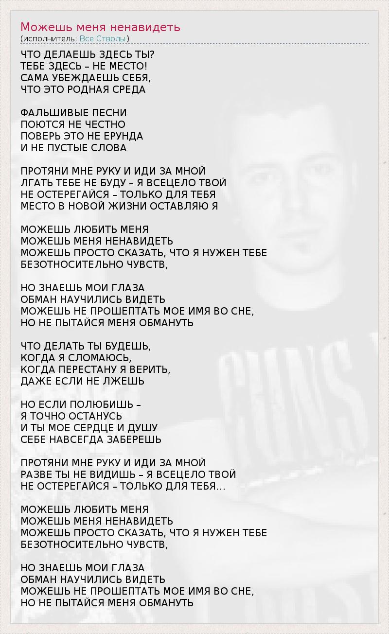 ЧТО ДЕЛАЕШЬ ЗДЕСЬ ТЫ? ТЕБЕ ЗДЕСЬ – НЕ МЕСТО! САМА УБЕЖДАЕШЬ СЕБЯ, ЧТО ЭТО РОДНАЯ СРЕДА ФАЛЬШИВЫЕ ПЕСНИ ПОЮТСЯ НЕ ЧЕСТНО ПОВЕРЬ ЭТО НЕ ЕРУНДА И НЕ ПУСТЫЕ СЛОВА ПРОТЯНИ МНЕ РУКУ И ИДИ ЗА МНОЙ ЛГАТЬ ТЕБЕ НЕ БУДУ – Я ВСЕЦЕЛО ТВОЙ НЕ ОСТЕРЕГАЙСЯ – ТОЛЬКО ДЛЯ ТЕБЯ МЕСТО В НОВОЙ ЖИЗНИ ОСТАВЛЯЮ Я МОЖЕШЬ ЛЮБИТЬ МЕНЯ МОЖЕШЬ МЕНЯ НЕНАВИДЕТЬ МОЖЕШЬ ПРОСТО СКАЗАТЬ, ЧТО Я НУЖЕН ТЕБЕ БЕЗОТНОСИТЕЛЬНО ЧУВСТВ, НО ЗНАЕШЬ МОИ ГЛАЗА ОБМАН НАУЧИЛИСЬ ВИДЕТЬ МОЖЕШЬ НЕ ПРОШЕПТАТЬ МОЕ ИМЯ ВО СНЕ, НО НЕ ПЫТАЙСЯ МЕНЯ ОБМАНУТЬ ЧТО ДЕЛАТЬ ТЫ БУДЕШЬ, КОГДА Я СЛОМАЮСЬ, КОГДА ПЕРЕСТАНУ Я ВЕРИТЬ, ДАЖЕ ЕСЛИ НЕ ЛЖЕШЬ НО ЕСЛИ ПОЛЮБИШЬ – Я ТОЧНО ОСТАНУСЬ И ТЫ МОЕ СЕРДЦЕ И ДУШУ СЕБЕ НАВСЕГДА ЗАБЕРЕШЬ ПРОТЯНИ МНЕ РУКУ И ИДИ ЗА МНОЙ РАЗВЕ ТЫ НЕ ВИДИШЬ – Я ВСЕЦЕЛО ТВОЙ НЕ ОСТЕРЕГАЙСЯ – ТОЛЬКО ДЛЯ ТЕБЯ… МОЖЕШЬ ЛЮБИТЬ МЕНЯ МОЖЕШЬ МЕНЯ НЕНАВИДЕТЬ МОЖЕШЬ ПРОСТО СКАЗАТЬ, ЧТО Я НУЖЕН ТЕБЕ БЕЗОТНОСИТЕЛЬНО ЧУВСТВ, НО ЗНАЕШЬ МОИ ГЛАЗА ОБМАН НАУЧИЛИСЬ ВИДЕТЬ МОЖЕШЬ НЕ ПРОШЕПТАТЬ МОЕ ИМЯ ВО СНЕ, НО НЕ ПЫТАЙСЯ МЕНЯ ОБМАНУТЬ