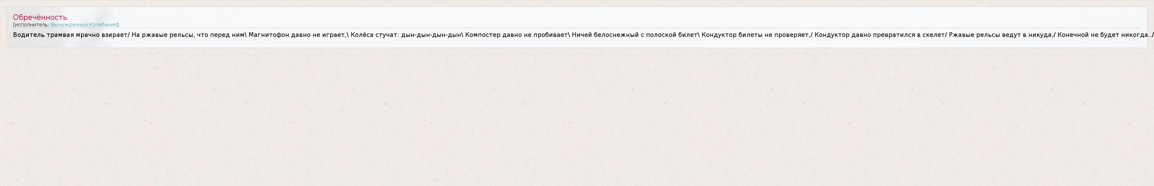 Водитель трамвая мрачно взирает/ На ржавые рельсы, что перед ним\ Магнитофон давно не играет,\ Колёса стучат: дын-дын-дын-дын\ Компостер давно не пробивает\ Ничей белоснежный с полоской билет\ Кондуктор билеты не проверяет,/ Кондуктор давно превратился в скелет/ Ржавые рельсы ведут в никуда,/ Конечной не будет никогда../