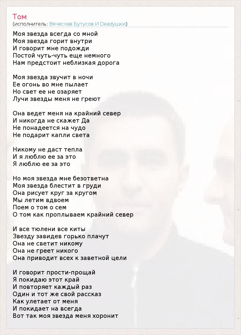 Моя звезда всегда со мной Моя звезда горит внутри И говорит мне подожди Постой чуть-чуть еще немного Нам предстоит неблизкая дорога Моя звезда звучит в ночи Ее огонь во мне пылает Но свет ее не озаряет Лучи звезды меня не греют Она ведет меня на крайний север И никогда не скажет Да Не понадеется на чудо Не подарит капли света Никому не даст тепла И я люблю ее за это Я люблю ее за это Но моя звезда мне безответна Моя звезда блестит в груди Она рисует круг за кругом Мы летим вдвоем Поем о том о сем О том как проплываем крайний север И все тюлени все киты Звезду завидев горько плачут Она не светит никому Она не греет никого Она приводит всех к заветной цели И говорит прости-прощай Я покидаю этот край И повторяет каждый раз Один и тот же свой рассказ Как улетает от меня И покидает на всегда Вот так моя звезда меня хоронит