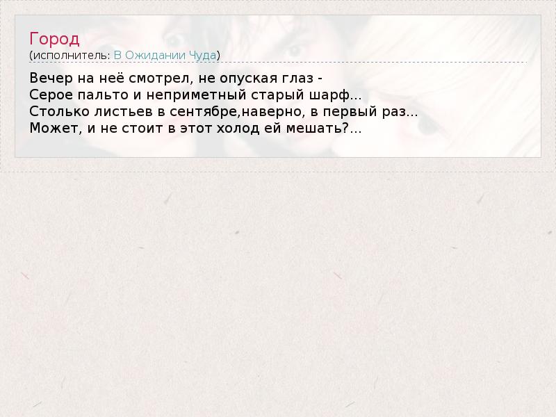 Вечер на неё смотрел, не опуская глаз - Серое пальто и неприметный старый шарф... Столько листьев в сентябре,наверно, в первый раз... Может, и не стоит в этот холод ей мешать?...