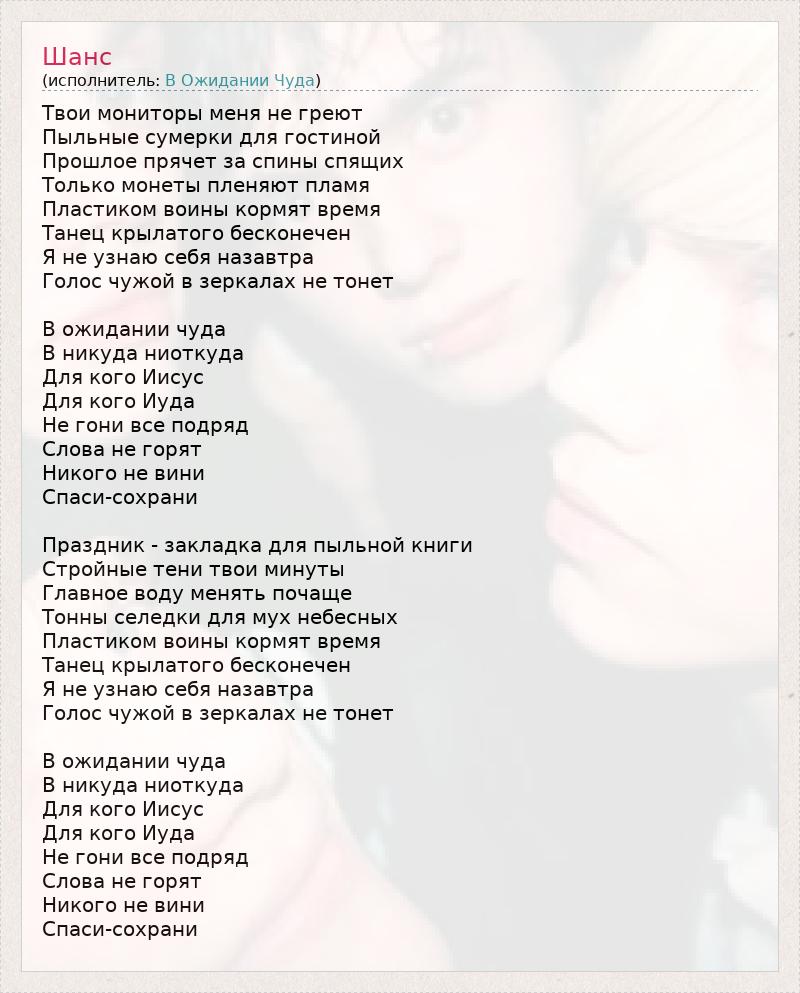 Твои мониторы меня не греют Пыльные сумерки для гостиной Прошлое прячет за спины спящих Только монеты пленяют пламя Пластиком воины кормят время Танец крылатого бесконечен Я не узнаю себя назавтра Голос чужой в зеркалах не тонет В ожидании чуда В никуда ниоткуда Для кого Иисус Для кого Иуда Не гони все подряд Слова не горят Никого не вини Спаси-сохрани Праздник - закладка для пыльной книги Стройные тени твои минуты Главное воду менять почаще Тонны селедки для мух небесных Пластиком воины кормят время Танец крылатого бесконечен Я не узнаю себя назавтра Голос чужой в зеркалах не тонет В ожидании чуда В никуда ниоткуда Для кого Иисус Для кого Иуда Не гони все подряд Слова не горят Никого не вини Спаси-сохрани