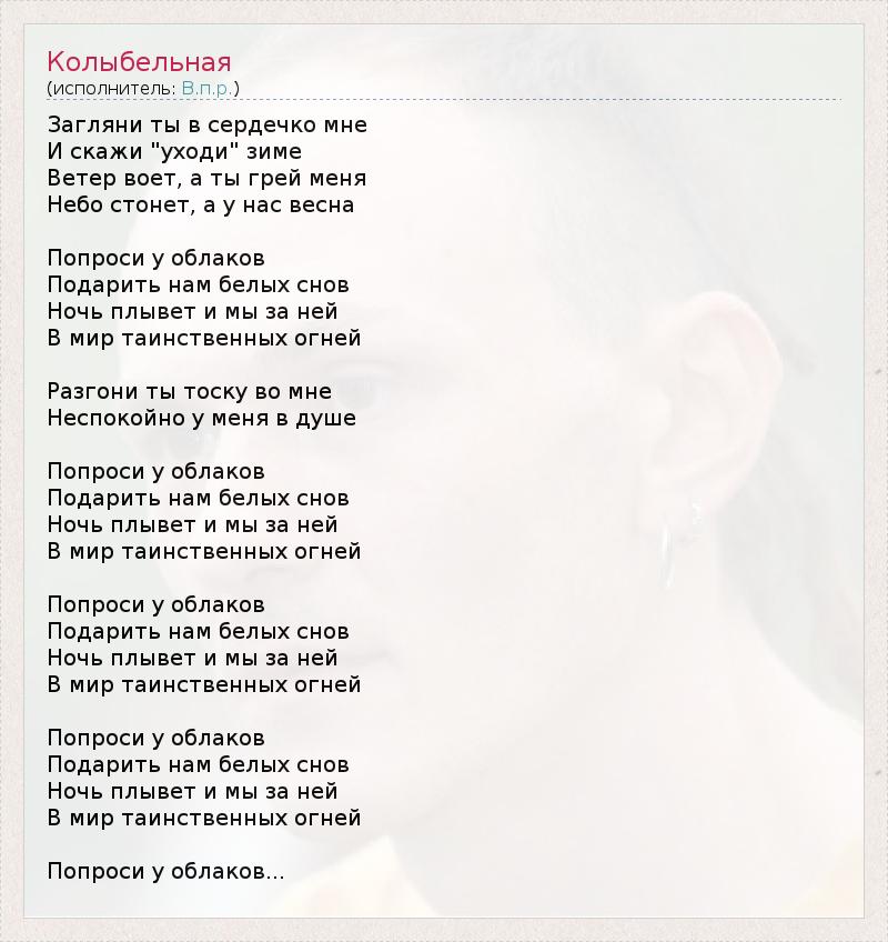 Загляни ты в сердечко мне И скажи "уходи" зиме Ветер воет, а ты грей меня Небо стонет, а у нас весна Попроси у облаков Подарить нам белых снов Ночь плывет и мы за ней В мир таинственных огней Разгони ты тоску во мне Неспокойно у меня в душе Попроси у облаков Подарить нам белых снов Ночь плывет и мы за ней В мир таинственных огней Попроси у облаков Подарить нам белых снов Ночь плывет и мы за ней В мир таинственных огней Попроси у облаков Подарить нам белых снов Ночь плывет и мы за ней В мир таинственных огней Попроси у облаков...