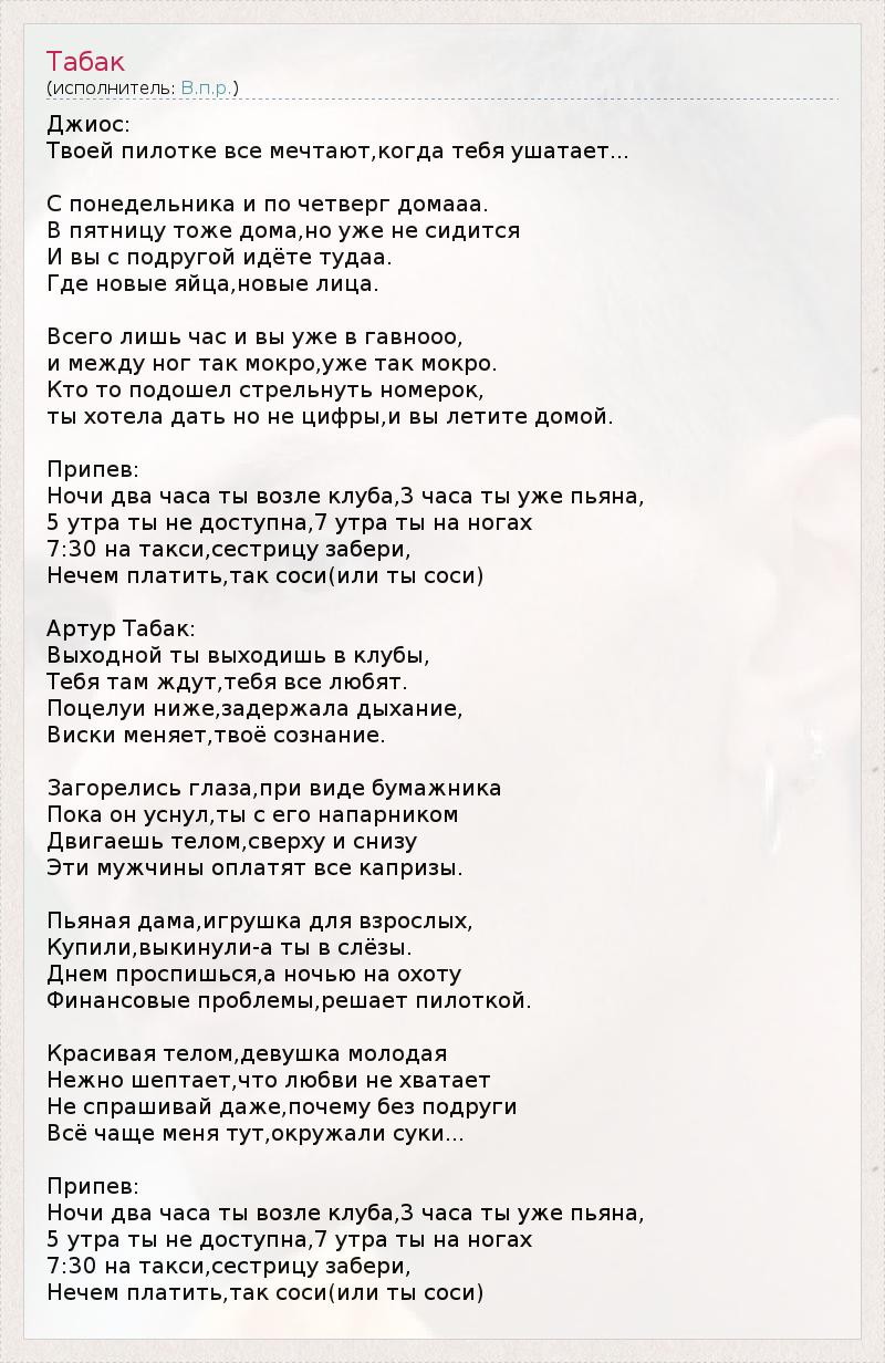 Джиос: Твоей пилотке все мечтают,когда тебя ушатает... С понедельника и по четверг домааа. В пятницу тоже дома,но уже не сидится И вы с подругой идёте тудаа. Где новые яйца,новые лица. Всего лишь час и вы уже в гавнооо, и между ног так мокро,уже так мокро. Кто то подошел стрельнуть номерок, ты хотела дать но не цифры,и вы летите домой. Припев: Ночи два часа ты возле клуба,3 часа ты уже пьяна, 5 утра ты не доступна,7 утра ты на ногах 7:30 на такси,сестрицу забери, Нечем платить,так соси(или ты соси) Артур Табак: Выходной ты выходишь в клубы, Тебя там ждут,тебя все любят. Поцелуи ниже,задержала дыхание, Виски меняет,твоё сознание. Загорелись глаза,при виде бумажника Пока он уснул,ты с его напарником Двигаешь телом,сверху и снизу Эти мужчины оплатят все капризы. Пьяная дама,игрушка для взрослых, Купили,выкинули-а ты в слёзы. Днем проспишься,а ночью на охоту Финансовые проблемы,решает пилоткой. Красивая телом,девушка молодая Нежно шептает,что любви не хватает Не спрашивай даже,почему без подруги Всё чаще меня тут,окружали суки... Припев: Ночи два часа ты возле клуба,3 часа ты уже пьяна, 5 утра ты не доступна,7 утра ты на ногах 7:30 на такси,сестрицу забери, Нечем платить,так соси(или ты соси)