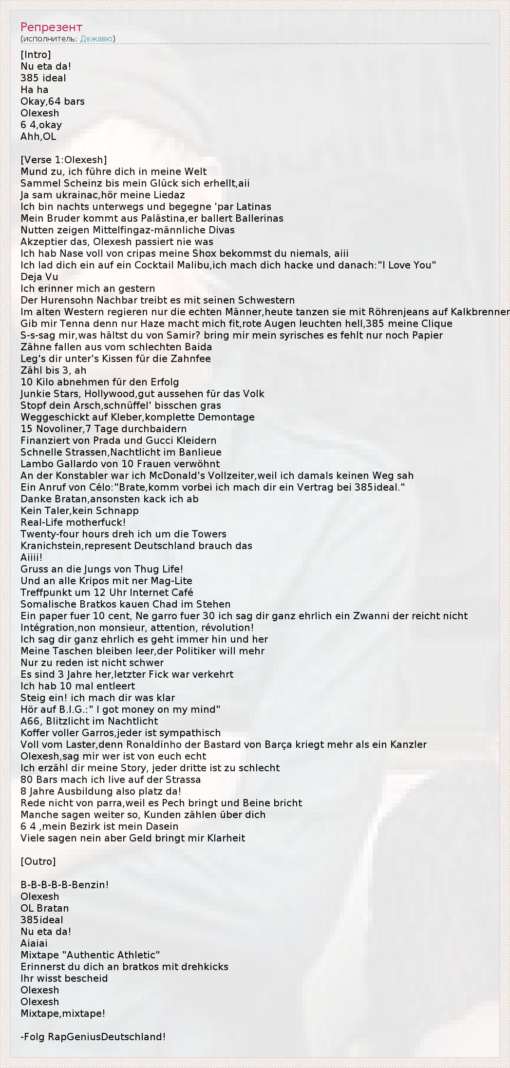 [Intro] Nu eta da! 385 ideal Ha ha Okay,64 bars Olexesh 6 4,okay Ahh,OL [Verse 1:Olexesh] Mund zu, ich führe dich in meine Welt Sammel Scheinz bis mein Glück sich erhellt,aii Ja sam ukrainac,hör meine Liedaz Ich bin nachts unterwegs und begegne 'par Latinas Mein Bruder kommt aus Palästina,er ballert Ballerinas Nutten zeigen Mittelfingaz-männliche Divas Akzeptier das, Olexesh passiert nie was Ich hab Nase voll von cripas meine Shox bekommst du niemals, aiii Ich lad dich ein auf ein Cocktail Malibu,ich mach dich hacke und danach:"I Love You" Deja Vu Ich erinner mich an gestern Der Hurensohn Nachbar treibt es mit seinen Schwestern Im alten Western regieren nur die echten Männer,heute tanzen sie mit Röhrenjeans auf Kalkbrenner Gib mir Tenna denn nur Haze macht mich fit,rote Augen leuchten hell,385 meine Clique S-s-sag mir,was hältst du von Samir? bring mir mein syrisches es fehlt nur noch Papier Zähne fallen aus vom schlechten Baida Leg's dir unter's Kissen für die Zahnfee Zähl bis 3, ah 10 Kilo abnehmen für den Erfolg Junkie Stars, Hollywood,gut aussehen für das Volk Stopf dein Arsch,schnüffel' bisschen gras Weggeschickt auf Kleber,komplette Demontage 15 Novoliner,7 Tage durchbaidern Finanziert von Prada und Gucci Kleidern Schnelle Strassen,Nachtlicht im Banlieue Lambo Gallardo von 10 Frauen verwöhnt An der Konstabler war ich McDonald's Vollzeiter,weil ich damals keinen Weg sah Ein Anruf von Célo:"Brate,komm vorbei ich mach dir ein Vertrag bei 385ideal." Danke Bratan,ansonsten kack ich ab Kein Taler,kein Schnapp Real-Life motherfuck! Twenty-four hours dreh ich um die Towers Kranichstein,represent Deutschland brauch das Aiiii! Gruss an die Jungs von Thug Life! Und an alle Kripos mit ner Mag-Lite Treffpunkt um 12 Uhr Internet Café Somalische Bratkos kauen Chad im Stehen Ein paper fuer 10 cent, Ne garro fuer 30 ich sag dir ganz ehrlich ein Zwanni der reicht nicht Intégration,non monsieur, attention, révolution! Ich sag dir ganz ehrlich es geht immer hin und her Meine Taschen bleiben leer,der Politiker will mehr Nur zu reden ist nicht schwer Es sind 3 Jahre her,letzter Fick war verkehrt Ich hab 10 mal entleert Steig ein! ich mach dir was klar Hör auf B.I.G.:" I got money on my mind" A66, Blitzlicht im Nachtlicht Koffer voller Garros,jeder ist sympathisch Voll vom Laster,denn Ronaldinho der Bastard von Barça kriegt mehr als ein Kanzler Olexesh,sag mir wer ist von euch echt Ich erzähl dir meine Story, jeder dritte ist zu schlecht 80 Bars mach ich live auf der Strassa 8 Jahre Ausbildung also platz da! Rede nicht von parra,weil es Pech bringt und Beine bricht Manche sagen weiter so, Kunden zählen über dich 6 4 ,mein Bezirk ist mein Dasein Viele sagen nein aber Geld bringt mir Klarheit [Outro] B-B-B-B-B-Benzin! Olexesh OL Bratan 385ideal Nu eta da! Aiaiai Mixtape "Authentic Athletic" Erinnerst du dich an bratkos mit drehkicks Ihr wisst bescheid Olexesh Olexesh Mixtape,mixtape! -Folg RapGeniusDeutschland!