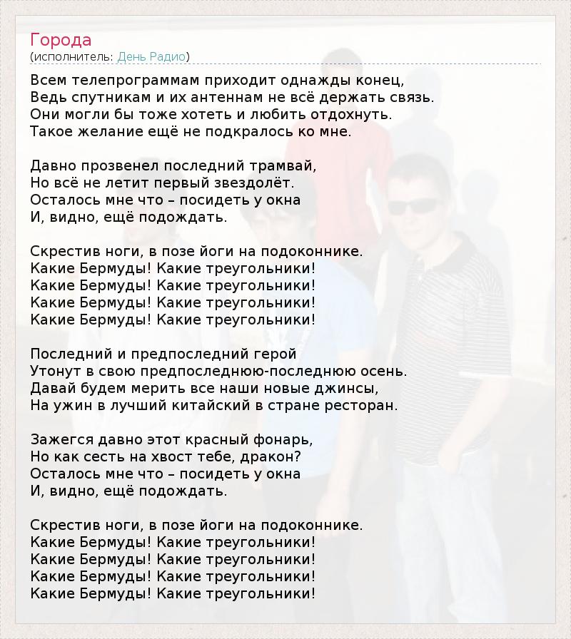 Всем телепрограммам приходит однажды конец, Ведь спутникам и их антеннам не всё держать связь. Они могли бы тоже хотеть и любить отдохнуть. Такое желание ещё не подкралось ко мне. Давно прозвенел последний трамвай, Но всё не летит первый звездолёт. Осталось мне что – посидеть у окна И, видно, ещё подождать. Скрестив ноги, в позе йоги на подоконнике. Какие Бермуды! Какие треугольники! Какие Бермуды! Какие треугольники! Какие Бермуды! Какие треугольники! Какие Бермуды! Какие треугольники! Последний и предпоследний герой Утонут в свою предпоследнюю-последнюю осень. Давай будем мерить все наши новые джинсы, На ужин в лучший китайский в стране ресторан. Зажегся давно этот красный фонарь, Но как сесть на хвост тебе, дракон? Осталось мне что – посидеть у окна И, видно, ещё подождать. Скрестив ноги, в позе йоги на подоконнике. Какие Бермуды! Какие треугольники! Какие Бермуды! Какие треугольники! Какие Бермуды! Какие треугольники! Какие Бермуды! Какие треугольники!