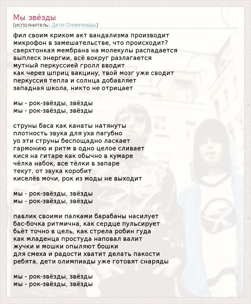 фил своим криком акт вандализма производит микрофон в замешательстве, что происходит? сверхтонкая мембрана на молекулы распадается выплеск энергии, всё вокруг разлагается мутный перкуссией гролл вводит как через шприц вакцину, твой мозг уже сводит перкуссия тепла и солнца добавляет западная школа, никто не отрицает мы - рок-звёзды, звёзды мы - рок-звёзды, звёзды струны баса как канаты натянуты плотность звука для уха пагубно yo эти струны беспощадно ласкает гармонию и ритм в одно целое сливает кися на гитаре как обычно в кумаре чёлка набок, все тёлки в запаре текут, от звука коробит киселёв мочи, рок из моды не выходит мы - рок-звёзды, звёзды мы - рок-звёзды, звёзды павлик своими палками барабаны насилует бас-бочка ритмична, как сердце пульсирует бьёт точно в цель, как стрела робин гуда как младенца простуда наповал валит жучки и мошки опыляют бошки для смеха и радости хватит делать пакости ребята, дети олимпиады уже готовят снаряды мы - рок-звёзды, звёзды мы - рок-звёзды, звёзды