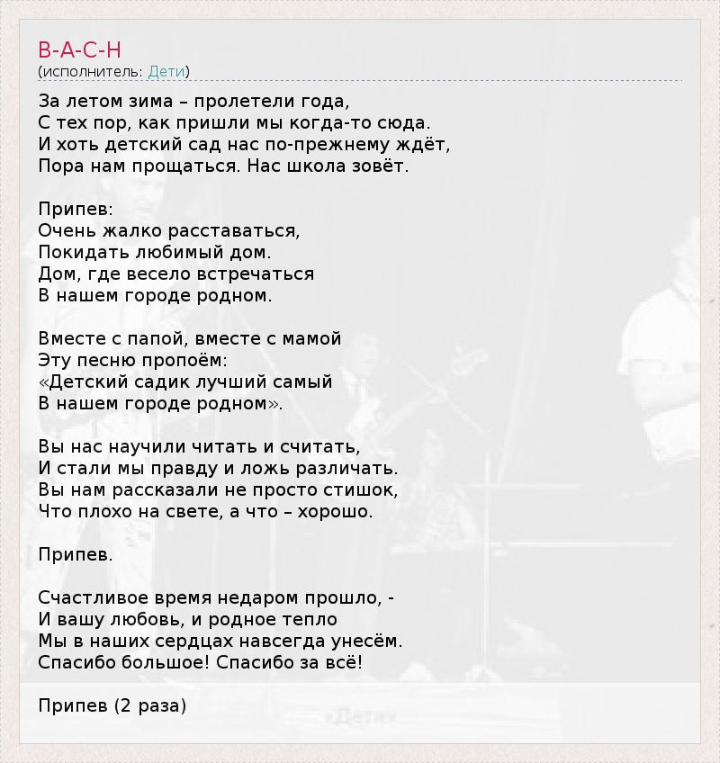 За летом зима – пролетели года, С тех пор, как пришли мы когда-то сюда. И хоть детский сад нас по-прежнему ждёт, Пора нам прощаться. Нас школа зовёт. Припев: Очень жалко расставаться, Покидать любимый дом. Дом, где весело встречаться В нашем городе родном. Вместе с папой, вместе с мамой Эту песню пропоём: «Детский садик лучший самый В нашем городе родном». Вы нас научили читать и считать, И стали мы правду и ложь различать. Вы нам рассказали не просто стишок, Что плохо на свете, а что – хорошо. Припев. Счастливое время недаром прошло, - И вашу любовь, и родное тепло Мы в наших сердцах навсегда унесём. Спасибо большое! Спасибо за всё! Припев (2 раза)