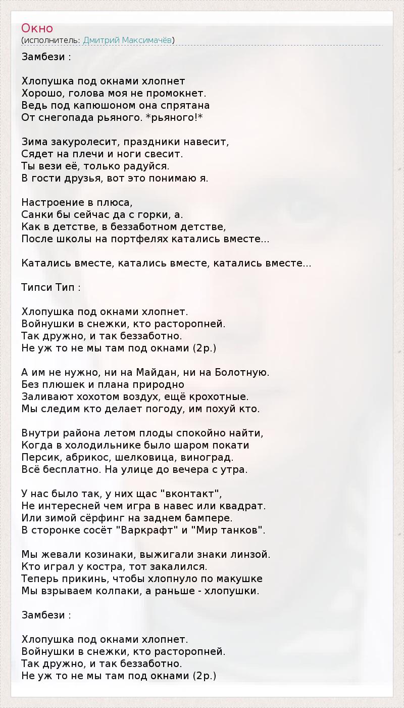 Это интересно:Дмитрий МаксимачЁв - петербургский музыкант. (www.maxistereo.ru) Его имя тесно связано с питерской группой ТАНКИ, где с 1995 он являлся лидером и автором большинства песен. С 2001 Дмитрий играет в акустическом составе Михаила Башакова (автором «Элис», «Самбади», «Не парься») в качестве бэк-вокалиста и перкуссиониста. Так же МаксимачЁв является саунд-продюссером всех альбомов... продолжение