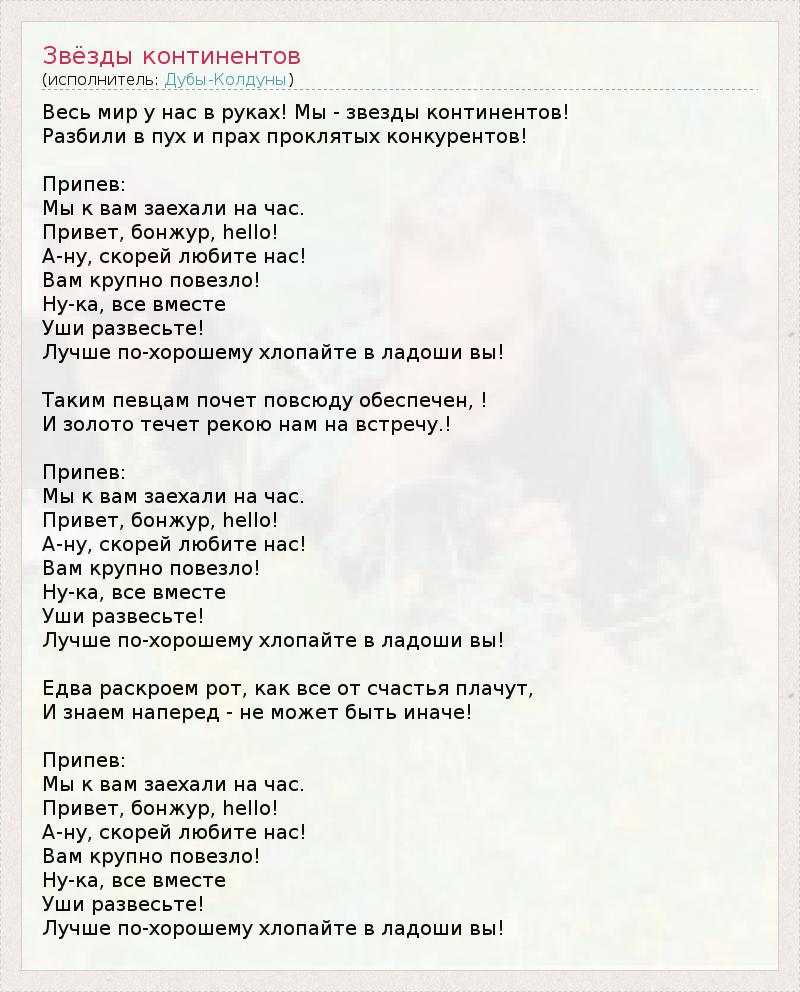 Весь мир у нас в руках! Мы - звезды континентов! Разбили в пух и прах проклятых конкурентов! Припев: Мы к вам заехали на час. Привет, бонжур, hello! А-ну, скорей любите нас! Вам крупно повезло! Ну-ка, все вместе Уши развесьте! Лучше по-хорошему хлопайте в ладоши вы! Таким певцам почет повсюду обеспечен, ! И золото течет рекою нам на встречу.! Припев: Мы к вам заехали на час. Привет, бонжур, hello! А-ну, скорей любите нас! Вам крупно повезло! Ну-ка, все вместе Уши развесьте! Лучше по-хорошему хлопайте в ладоши вы! Едва раскроем рот, как все от счастья плачут, И знаем наперед - не может быть иначе! Припев: Мы к вам заехали на час. Привет, бонжур, hello! А-ну, скорей любите нас! Вам крупно повезло! Ну-ка, все вместе Уши развесьте! Лучше по-хорошему хлопайте в ладоши вы!