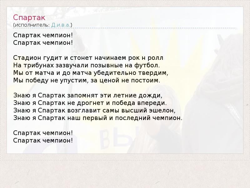 Спартак чемпион! Спартак чемпион! Стадион гудит и стонет начинаем рок н ролл На трибунах зазвучали позывные на футбол. Мы от матча и до матча убедительно твердим, Мы победу не упустим, за ценой не постоим. Знаю я Спартак запомнят эти летние дожди, Знаю я Спартак не дрогнет и победа впереди. Знаю я Спартак возглавит самы высший эшелон, Знаю я Спартак наш первый и последний чемпион. Спартак чемпион! Спартак чемпион!