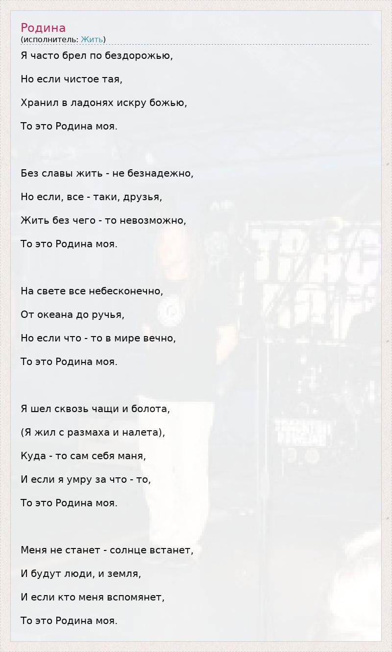 Я часто брел по бездорожью, Но если чистое тая, Хранил в ладонях искру божью, То это Родина моя. Без славы жить - не безнадежно, Но если, все - таки, друзья, Жить без чего - то невозможно, То это Родина моя. На свете все небесконечно, От океана до ручья, Но если что - то в мире вечно, То это Родина моя. Я шел сквозь чащи и болота, (Я жил с размаха и налета), Куда - то сам себя маня, И если я умру за что - то, То это Родина моя. Меня не станет - солнце встанет, И будут люди, и земля, И если кто меня вспомянет, То это Родина моя.