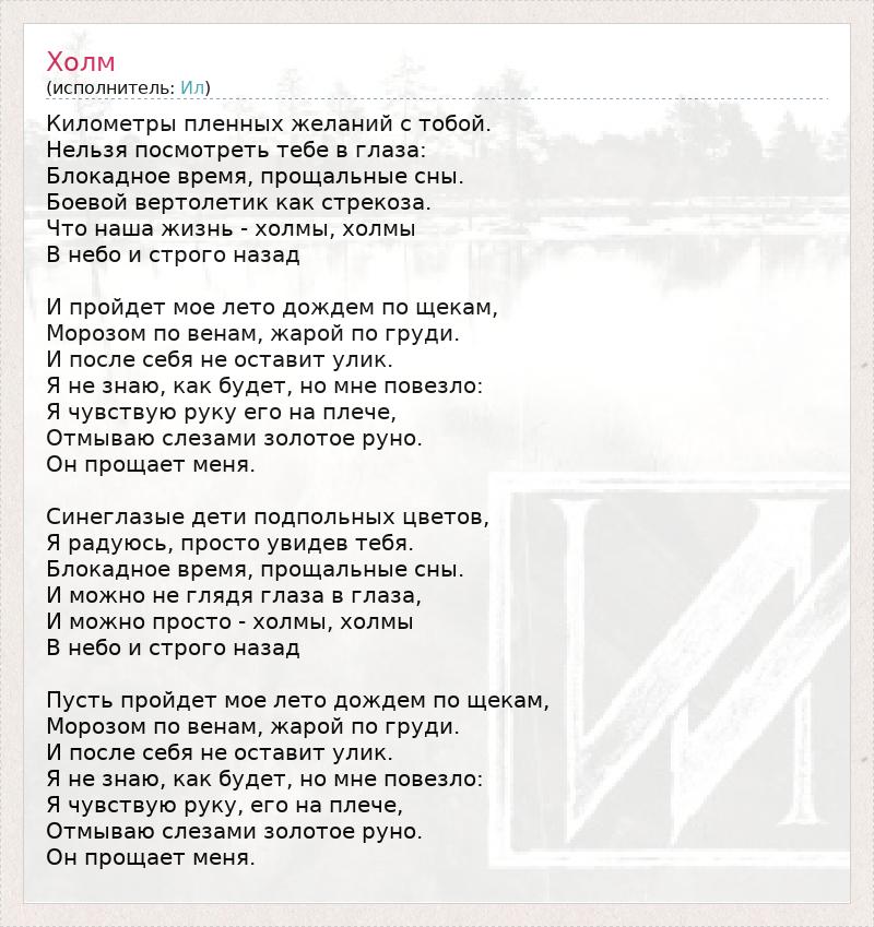 Километры пленных желаний с тобой. Нельзя посмотреть тебе в глаза: Блокадное время, прощальные сны. Боевой вертолетик как стрекоза. Что наша жизнь - холмы, холмы В небо и строго назад И пройдет мое лето дождем по щекам, Морозом по венам, жарой по груди. И после себя не оставит улик. Я не знаю, как будет, но мне повезло: Я чувствую руку его на плече, Отмываю слезами золотое руно. Он прощает меня. Синеглазые дети подпольных цветов, Я радуюсь, просто увидев тебя. Блокадное время, прощальные сны. И можно не глядя глаза в глаза, И можно просто - холмы, холмы В небо и строго назад Пусть пройдет мое лето дождем по щекам, Морозом по венам, жарой по груди. И после себя не оставит улик. Я не знаю, как будет, но мне повезло: Я чувствую руку, его на плече, Отмываю слезами золотое руно. Он прощает меня.