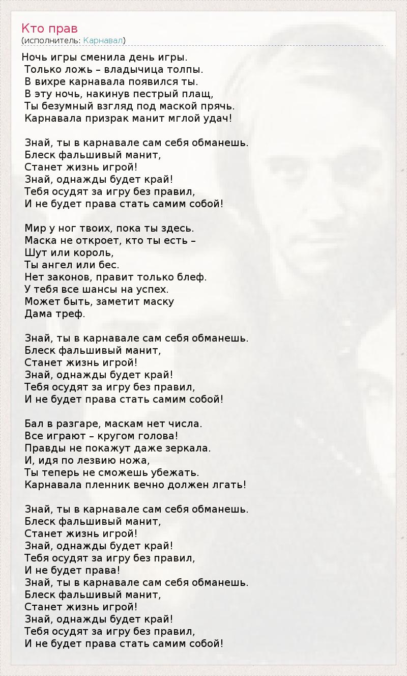 Ночь игры сменила день игры. Только ложь – владычица толпы. В вихре карнавала появился ты. В эту ночь, накинув пестрый плащ, Ты безумный взгляд под маской прячь. Карнавала призрак манит мглой удач! Знай, ты в карнавале сам себя обманешь. Блеск фальшивый манит, Станет жизнь игрой! Знай, однажды будет край! Тебя осудят за игру без правил, И не будет права стать самим собой! Мир у ног твоих, пока ты здесь. Маска не откроет, кто ты есть – Шут или король, Ты ангел или бес. Нет законов, правит только блеф. У тебя все шансы на успех. Может быть, заметит маску Дама треф. Знай, ты в карнавале сам себя обманешь. Блеск фальшивый манит, Станет жизнь игрой! Знай, однажды будет край! Тебя осудят за игру без правил, И не будет права стать самим собой! Бал в разгаре, маскам нет числа. Все играют – кругом голова! Правды не покажут даже зеркала. И, идя по лезвию ножа, Ты теперь не сможешь убежать. Карнавала пленник вечно должен лгать! Знай, ты в карнавале сам себя обманешь. Блеск фальшивый манит, Станет жизнь игрой! Знай, однажды будет край! Тебя осудят за игру без правил, И не будет права! Знай, ты в карнавале сам себя обманешь. Блеск фальшивый манит, Станет жизнь игрой! Знай, однажды будет край! Тебя осудят за игру без правил, И не будет права стать самим собой!