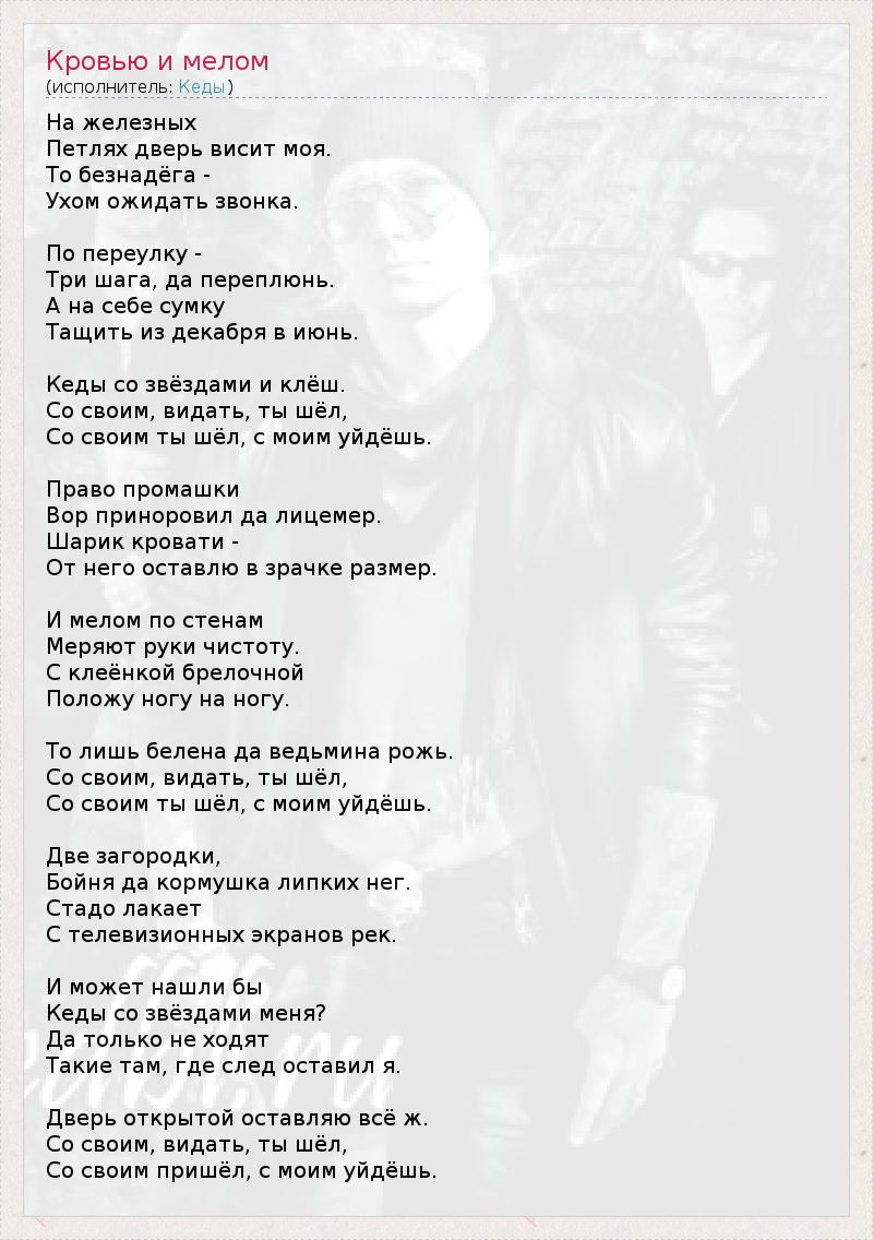 На железных Петлях дверь висит моя. То безнадёга - Ухом ожидать звонка. По переулку - Три шага, да переплюнь. А на себе сумку Тащить из декабря в июнь. Кеды со звёздами и клёш. Со своим, видать, ты шёл, Со своим ты шёл, с моим уйдёшь. Право промашки Вор приноровил да лицемер. Шарик кровати - От него оставлю в зрачке размер. И мелом по стенам Меряют руки чистоту. С клеёнкой брелочной Положу ногу на ногу. То лишь белена да ведьмина рожь. Со своим, видать, ты шёл, Со своим ты шёл, с моим уйдёшь. Две загородки, Бойня да кормушка липких нег. Стадо лакает С телевизионных экранов рек. И может нашли бы Кеды со звёздами меня? Да только не ходят Такие там, где след оставил я. Дверь открытой оставляю всё ж. Со своим, видать, ты шёл, Со своим пришёл, с моим уйдёшь.