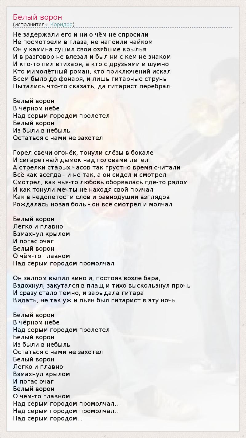 Не задержали его и ни о чём не спросили Не посмотрели в глаза, не напоили чайком Он у камина сушил свои озябшие крылья И в разговор не влезал и был ни с кем не знаком И кто-то пил втихаря, а кто с друзьями и шумно Кто мимолётный роман, кто приключений искал Всем было до фонаря, и лишь гитарные струны Пытались что-то сказать, да гитарист перебрал. Белый ворон В чёрном небе Над серым городом пролетел Белый ворон Из были в небыль Остаться с нами не захотел Горел свечи огонёк, тонули слёзы в бокале И сигаретный дымок над головами летел А стрелки старых часов так грустно время считали Всё как всегда - и не так, а он сидел и смотрел Смотрел, как чья-то любовь оборвалась где-то рядом И как тонули мечты не находя свой причал Как в недопетости слов и равнодушии взглядов Рождалась новая боль - он всё смотрел и молчал Белый ворон Легко и плавно Взмахнул крылом И погас очаг Белый ворон О чём-то главном Над серым городом промолчал Он залпом выпил вино и, постояв возле бара, Вздохнул, закутался в плащ и тихо выскользнул прочь И сразу стало темно, и зарыдала гитара Видать, не так уж и пьян был гитарист в эту ночь. Белый ворон В чёрном небе Над серым городом пролетел Белый ворон Из были в небыль Остаться с нами не захотел Белый ворон Легко и плавно Взмахнул крылом И погас очаг Белый ворон О чём-то главном Над серым городом промолчал... Над серым городом промолчал... Над серым городом...