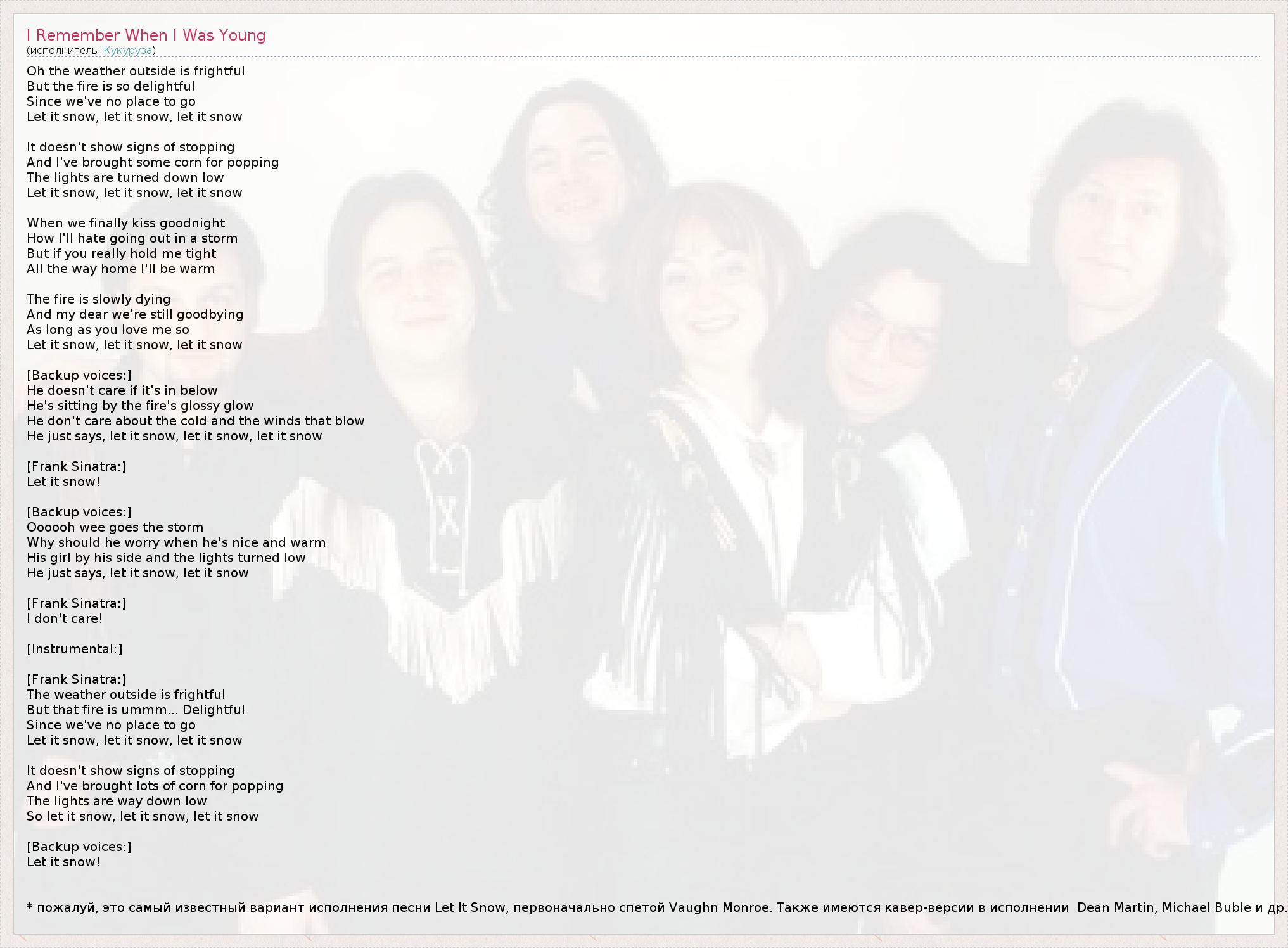 Oh the weather outside is frightful But the fire is so delightful Since we've no place to go Let it snow, let it snow, let it snow It doesn't show signs of stopping And I've brought some corn for popping The lights are turned down low Let it snow, let it snow, let it snow When we finally kiss goodnight How I'll hate going out in a storm But if you really hold me tight All the way home I'll be warm The fire is slowly dying And my dear we're still goodbying As long as you love me so Let it snow, let it snow, let it snow [Backup voices:] He doesn't care if it's in below He's sitting by the fire's glossy glow He don't care about the cold and the winds that blow He just says, let it snow, let it snow, let it snow [Frank Sinatra:] Let it snow! [Backup voices:] Oooooh wee goes the storm Why should he worry when he's nice and warm His girl by his side and the lights turned low He just says, let it snow, let it snow [Frank Sinatra:] I don't care! [Instrumental:] [Frank Sinatra:] The weather outside is frightful But that fire is ummm... Delightful Since we've no place to go Let it snow, let it snow, let it snow It doesn't show signs of stopping And I've brought lots of corn for popping The lights are way down low So let it snow, let it snow, let it snow [Backup voices:] Let it snow! * пожалуй, это самый известный вариант исполнения песни Let It Snow, первоначально спетой Vaughn Monroe. Также имеются кавер-версии в исполнении Dean Martin, Michael Buble и др.