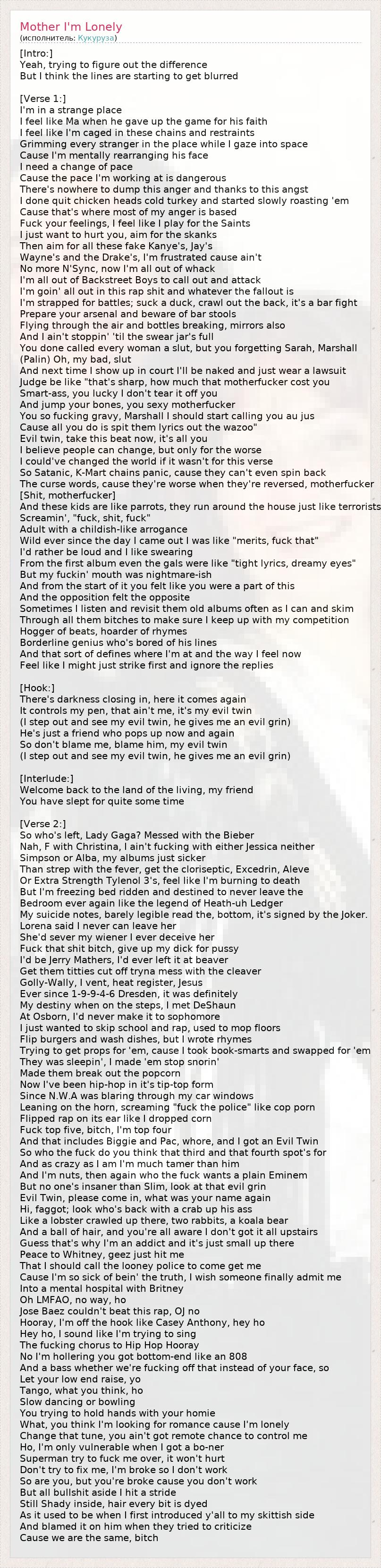 [Intro:] Yeah, trying to figure out the difference But I think the lines are starting to get blurred [Verse 1:] I'm in a strange place I feel like Ma when he gave up the game for his faith I feel like I'm caged in these chains and restraints Grimming every stranger in the place while I gaze into space Cause I'm mentally rearranging his face I need a change of pace Cause the pace I'm working at is dangerous There's nowhere to dump this anger and thanks to this angst I done quit chicken heads cold turkey and started slowly roasting 'em Cause that's where most of my anger is based Fuck your feelings, I feel like I play for the Saints I just want to hurt you, aim for the skanks Then aim for all these fake Kanye's, Jay's Wayne's and the Drake's, I'm frustrated cause ain't No more N'Sync, now I'm all out of whack I'm all out of Backstreet Boys to call out and attack I'm goin' all out in this rap shit and whatever the fallout is I'm strapped for battles; suck a duck, crawl out the back, it's a bar fight Prepare your arsenal and beware of bar stools Flying through the air and bottles breaking, mirrors also And I ain't stoppin' 'til the swear jar's full You done called every woman a slut, but you forgetting Sarah, Marshall (Palin) Oh, my bad, slut And next time I show up in court I'll be naked and just wear a lawsuit Judge be like "that's sharp, how much that motherfucker cost you Smart-ass, you lucky I don't tear it off you And jump your bones, you sexy motherfucker You so fucking gravy, Marshall I should start calling you au jus Cause all you do is spit them lyrics out the wazoo" Evil twin, take this beat now, it's all you I believe people can change, but only for the worse I could've changed the world if it wasn't for this verse So Satanic, K-Mart chains panic, cause they can't even spin back The curse words, cause they're worse when they're reversed, motherfucker [Shit, motherfucker] And these kids are like parrots, they run around the house just like terrorists Screamin', "fuck, shit, fuck" Adult with a childish-like arrogance Wild ever since the day I came out I was like "merits, fuck that" I'd rather be loud and I like swearing From the first album even the gals were like "tight lyrics, dreamy eyes" But my fuckin' mouth was nightmare-ish And from the start of it you felt like you were a part of this And the opposition felt the opposite Sometimes I listen and revisit them old albums often as I can and skim Through all them bitches to make sure I keep up with my competition Hogger of beats, hoarder of rhymes Borderline genius who's bored of his lines And that sort of defines where I'm at and the way I feel now Feel like I might just strike first and ignore the replies [Hook:] There's darkness closing in, here it comes again It controls my pen, that ain't me, it's my evil twin (I step out and see my evil twin, he gives me an evil grin) He's just a friend who pops up now and again So don't blame me, blame him, my evil twin (I step out and see my evil twin, he gives me an evil grin) [Interlude:] Welcome back to the land of the living, my friend You have slept for quite some time [Verse 2:] So who's left, Lady Gaga? Messed with the Bieber Nah, F with Christina, I ain't fucking with either Jessica neither Simpson or Alba, my albums just sicker Than strep with the fever, get the cloriseptic, Excedrin, Aleve Or Extra Strength Tylenol 3's, feel like I'm burning to death But I'm freezing bed ridden and destined to never leave the Bedroom ever again like the legend of Heath-uh Ledger My suicide notes, barely legible read the, bottom, it's signed by the Joker. Lorena said I never can leave her She'd sever my wiener I ever deceive her Fuck that shit bitch, give up my dick for pussy I'd be Jerry Mathers, I'd ever left it at beaver Get them titties cut off tryna mess with the cleaver Golly-Wally, I vent, heat register, Jesus Ever since 1-9-9-4-6 Dresden, it was definitely My destiny when on the steps, I met DeShaun At Osborn, I'd never make it to sophomore I just wanted to skip school and rap, used to mop floors Flip burgers and wash dishes, but I wrote rhymes Trying to get props for 'em, cause I took book-smarts and swapped for 'em They was sleepin', I made 'em stop snorin' Made them break out the popcorn Now I've been hip-hop in it's tip-top form Since N.W.A was blaring through my car windows Leaning on the horn, screaming "fuck the police" like cop porn Flipped rap on its ear like I dropped corn Fuck top five, bitch, I'm top four And that includes Biggie and Pac, whore, and I got an Evil Twin So who the fuck do you think that third and that fourth spot's for And as crazy as I am I'm much tamer than him And I'm nuts, then again who the fuck wants a plain Eminem But no one's insaner than Slim, look at that evil grin Evil Twin, please come in, what was your name again Hi, faggot; look who's back with a crab up his ass Like a lobster crawled up there, two rabbits, a koala bear And a ball of hair, and you're all aware I don't got it all upstairs Guess that's why I'm an addict and it's just small up there Peace to Whitney, geez just hit me That I should call the looney police to come get me Cause I'm so sick of bein' the truth, I wish someone finally admit me Into a mental hospital with Britney Oh LMFAO, no way, ho Jose Baez couldn't beat this rap, OJ no Hooray, I'm off the hook like Casey Anthony, hey ho Hey ho, I sound like I'm trying to sing The fucking chorus to Hip Hop Hooray No I'm hollering you got bottom-end like an 808 And a bass whether we're fucking off that instead of your face, so Let your low end raise, yo Tango, what you think, ho Slow dancing or bowling You trying to hold hands with your homie What, you think I'm looking for romance cause I'm lonely Change that tune, you ain't got remote chance to control me Ho, I'm only vulnerable when I got a bo-ner Superman try to fuck me over, it won't hurt Don't try to fix me, I'm broke so I don't work So are you, but you're broke cause you don't work Bu