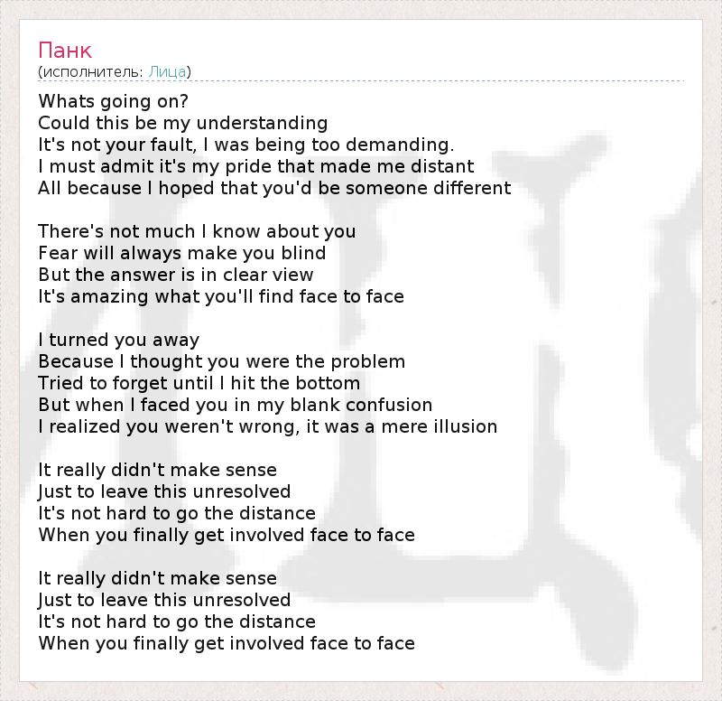 Что происходит? Может быть, это моё восприятие? Это не твоя вина, я был слишком требовательным. Я должен признать, что моя гордость заставила меня отдалиться, Всё потому, что я надеялся, что ты будешь другой. Надо же, я не так и много знаю о тебе... Страх всегда делает тебя слепым, Но ответ на виду. Удивительно, что вы обнаружите, встав лицом к лицу Я отверг тебя, Потому что считал тебя проблемой, Я пытался забыть об этом, пока не спустился на самое дно. Но когда я столкнулся с тобой в смятении, Я понял, что ты не ошиблась, это была просто иллюзия. В этом действительно нет смысла, Просто оставьте это нерешённым. Не так и трудно держаться на расстоянии, Когда ты, наконец, добился встречи лицом к лицу. В этом действительно нет смысла, Просто оставьте это нерешённым. Не так и трудно держаться на расстоянии, Когда ты, наконец, добился встречи лицом к лицу.