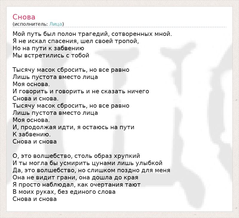 Мой путь был полон трагедий, сотворенных мной. Я не искал спасения, шел своей тропой, Но на пути к забвению Мы встретились с тобой Тысячу масок сбросить, но все равно Лишь пустота вместо лица Моя основа. И говорить и говорить и не сказать ничего Снова и снова. Тысячу масок сбросить, но все равно Лишь пустота вместо лица Моя основа. И, продолжая идти, я остаюсь на пути К забвению. Снова и снова О, это волшебство, столь образ хрупкий И ты могла бы усмирить цунами лишь улыбкой Да, это волшебство, но слишком поздно для меня Она не видит грани, она дошла до края Я просто наблюдал, как очертания тают В моих руках, без единого слова Снова и снова