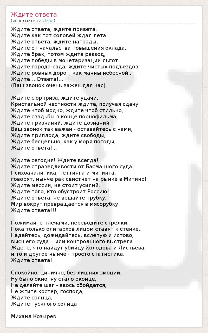 Ждите ответа, ждите привета, Ждите как тот соловей ждал лета. Ждите ответа, ждите награды, Ждите от начальства повышения оклада. Ждите брак, потом ждите развод, Ждите победы в монетаризации льгот. Ждите города-сада, ждите чистых подъездов, Ждите ровных дорог, как манны небесной... Ждите!...Ответа!... (Ваш звонок очень важен для нас) Ждите сюрприза, ждите удачи, Кристальной честности ждите, получая сдачу. Ждите чтоб модно, ждите чтоб стильно, Ждите свадьбы в конце порнофильма, Ждите признаний, ждите дознаний - Ваш звонок так важен - оставайтесь с нами, Ждите приплода, ждите свободы, Ждите бесцельно, как у моря погоды, Ждите ответа!... Ждите сегодня! Ждите всегда! Ждите справедливости от Басманного суда! Психоаналитика, петтинга и митинга, говорят, нынче рак свистнет на рынке в Митино! Ждите мессии, не стоит усилий, Ждите того, кто обустроит Россию! Ждите ответа, не вешайте трубку, Мир вокруг превращается в мясорубку! Ждите ответа!!! Пожимайте плечами, переводите стрелки, Пока только олигархов лицом ставят к стенке. Надейтесь, дожидайтесь, вслепую и истово, высшего суда... или контрольного выстрела! Ждете, что найдут убийцу Холодова и Листьева, и то и другое нынче - просто статистика. Ждите ответа! Спокойно, цинично, без лишних эмоций, Ну было окно, ну стало оконце, Не делайте шаг - авось обойдется, Не жгите костер, господа, Ждите солнца, Ждите тусклого солнца! Михаил Козырев