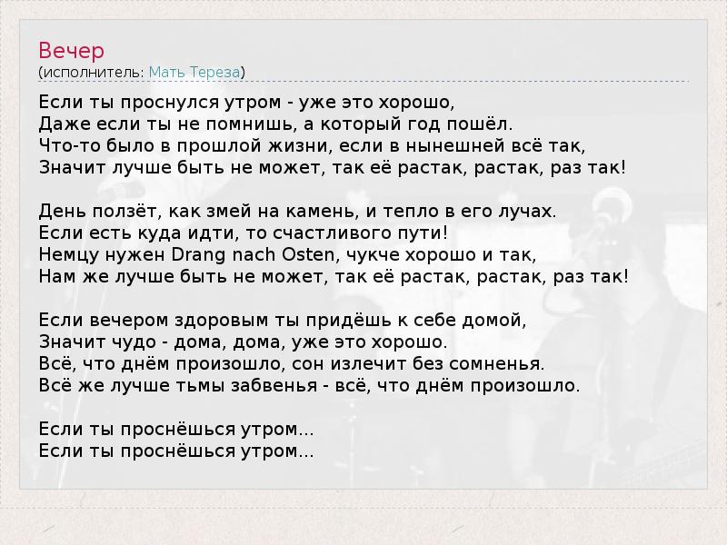 Если ты проснулся утром - уже это хорошо, Даже если ты не помнишь, а который год пошёл. Что-то было в прошлой жизни, если в нынешней всё так, Значит лучше быть не может, так её растак, растак, раз так! День ползёт, как змей на камень, и тепло в его лучах. Если есть куда идти, то счастливого пути! Немцу нужен Drang nach Osten, чукче хорошо и так, Нам же лучше быть не может, так её растак, растак, раз так! Если вечером здоровым ты придёшь к себе домой, Значит чудо - дома, дома, уже это хорошо. Всё, что днём произошло, сон излечит без сомненья. Всё же лучше тьмы забвенья - всё, что днём произошло. Если ты проснёшься утром... Если ты проснёшься утром...
