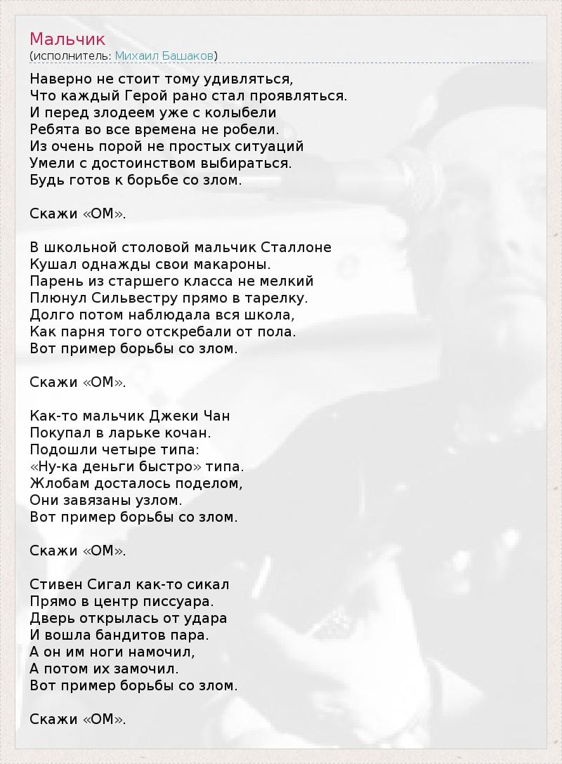 Это интересно:Для группы Михаила Башакова используйте тег БашаковКогда-то, в далёкие 80-е, Михаил Башаков пел свои песни в сопровождении группы "Духи". В той же группе, кстати, на баяне и саксофоне играл Павел Кашин; впоследствии Кашин исполнял некоторые песни Башакова и даже записал целый альбом песен на его стихи ("Герой").C разными музыкантами, в... продолжение