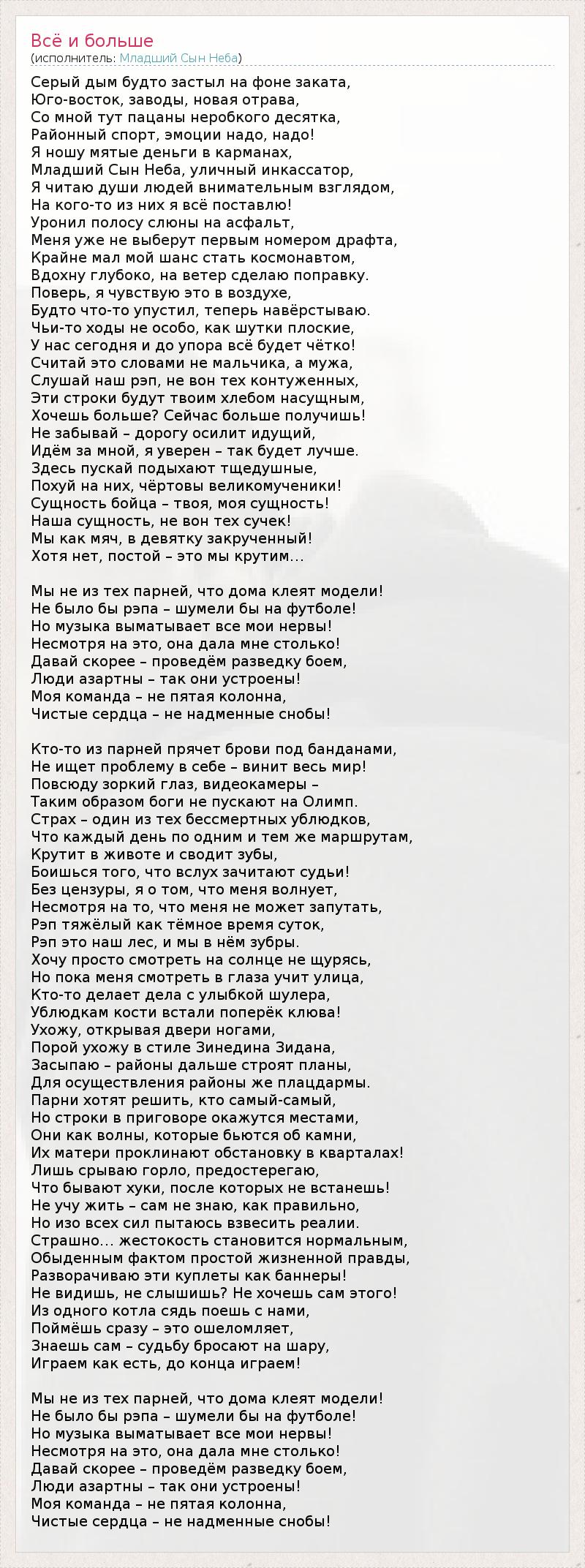 Серый дым будто застыл на фоне заката, Юго-восток, заводы, новая отрава, Со мной тут пацаны неробкого десятка, Районный спорт, эмоции надо, надо! Я ношу мятые деньги в карманах, Младший Сын Неба, уличный инкассатор, Я читаю души людей внимательным взглядом, На кого-то из них я всё поставлю! Уронил полосу слюны на асфальт, Меня уже не выберут первым номером драфта, Крайне мал мой шанс стать космонавтом, Вдохну глубоко, на ветер сделаю поправку. Поверь, я чувствую это в воздухе, Будто что-то упустил, теперь навёрстываю. Чьи-то ходы не особо, как шутки плоские, У нас сегодня и до упора всё будет чётко! Считай это словами не мальчика, а мужа, Слушай наш рэп, не вон тех контуженных, Эти строки будут твоим хлебом насущным, Хочешь больше? Сейчас больше получишь! Не забывай – дорогу осилит идущий, Идём за мной, я уверен – так будет лучше. Здесь пускай подыхают тщедушные, Похуй на них, чёртовы великомученики! Сущность бойца – твоя, моя сущность! Наша сущность, не вон тех сучек! Мы как мяч, в девятку закрученный! Хотя нет, постой – это мы крутим… Мы не из тех парней, что дома клеят модели! Не было бы рэпа – шумели бы на футболе! Но музыка выматывает все мои нервы! Несмотря на это, она дала мне столько! Давай скорее – проведём разведку боем, Люди азартны – так они устроены! Моя команда – не пятая колонна, Чистые сердца – не надменные снобы! Кто-то из парней прячет брови под банданами, Не ищет проблему в себе – винит весь мир! Повсюду зоркий глаз, видеокамеры – Таким образом боги не пускают на Олимп. Страх – один из тех бессмертных ублюдков, Что каждый день по одним и тем же маршрутам, Крутит в животе и сводит зубы, Боишься того, что вслух зачитают судьи! Без цензуры, я о том, что меня волнует, Несмотря на то, что меня не может запутать, Рэп тяжёлый как тёмное время суток, Рэп это наш лес, и мы в нём зубры. Хочу просто смотреть на солнце не щурясь, Но пока меня смотреть в глаза учит улица, Кто-то делает дела с улыбкой шулера, Ублюдкам кости встали поперёк клюва! Ухожу, открывая двери ногами, Порой ухожу в стиле Зинедина Зидана, Засыпаю – районы дальше строят планы, Для осуществления районы же плацдармы. Парни хотят решить, кто самый-самый, Но строки в приговоре окажутся местами, Они как волны, которые бьются об камни, Их матери проклинают обстановку в кварталах! Лишь срываю горло, предостерегаю, Что бывают хуки, после которых не встанешь! Не учу жить – сам не знаю, как правильно, Но изо всех сил пытаюсь взвесить реалии. Страшно… жестокость становится нормальным, Обыденным фактом простой жизненной правды, Разворачиваю эти куплеты как баннеры! Не видишь, не слышишь? Не хочешь сам этого! Из одного котла сядь поешь с нами, Поймёшь сразу – это ошеломляет, Знаешь сам – судьбу бросают на шару, Играем как есть, до конца играем! Мы не из тех парней, что дома клеят модели! Не было бы рэпа – шумели бы на футболе! Но музыка выматывает все мои нервы! Несмотря на это, она дала мне столько! Давай скорее – проведём разведку боем, Люди азартны – так они устроены! Моя команда – не пятая колонна, Чистые сердца – не надменные снобы!