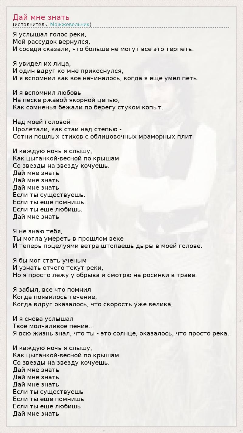 Я услышал голос реки, Мой рассудок вернулся, И соседи сказали, что больше не могут все это терпеть. Я увидел их лица, И один вдруг ко мне прикоснулся, И я вспомнил как все начиналось, когда я еще умел петь. И я вспомнил любовь На песке ржавой якорной цепью, Как сомненья бежали по берегу стуком копыт. Над моей головой Пролетали, как стаи над степью - Сотни пошлых стихов с облицовочных мраморных плит И каждую ночь я слышу, Как цыганкой-весной по крышам Со звезды на звезду кочуешь. Дай мне знать Дай мне знать Дай мне знать Если ты существуешь. Если ты еще помнишь. Если ты еще любишь. Дай мне знать Я не знаю тебя, Ты могла умереть в прошлом веке И теперь поцелуями ветра штопаешь дыры в моей голове. Я бы мог стать ученым И узнать отчего текут реки, Но я просто лежу у обрыва и смотрю на росинки в траве. Я забыл, все что помнил Когда появилось течение, Когда вдруг оказалось, что скорость уже велика, И я снова услышал Твое молчаливое пение... Я всю жизнь знал, что ты - это солнце, оказалось, что просто река.. И каждую ночь я слышу, Как цыганкой-весной по крышам Со звезды на звезду кочуешь. Дай мне знать Дай мне знать Дай мне знать Если ты существуешь Если ты еще помнишь Если ты еще любишь Дай мне знать
