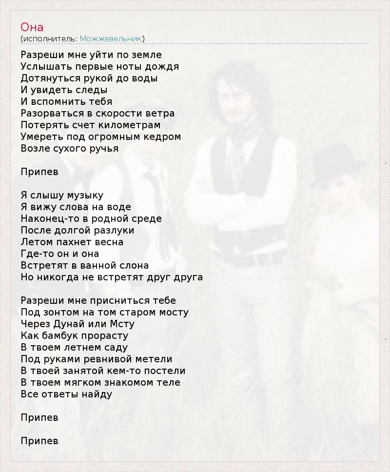 Разреши мне уйти по земле Услышать первые ноты дождя Дотянуться рукой до воды И увидеть следы И вспомнить тебя Разорваться в скорости ветра Потерять счет километрам Умереть под огромным кедром Возле сухого ручья Припев Я слышу музыку Я вижу слова на воде Наконец-то в родной среде После долгой разлуки Летом пахнет весна Где-то он и она Встретят в ванной слона Но никогда не встретят друг друга Разреши мне присниться тебе Под зонтом на том старом мосту Через Дунай или Мсту Как бамбук прорасту В твоем летнем саду Под руками ревнивой метели В твоей занятой кем-то постели В твоем мягком знакомом теле Все ответы найду Припев Припев