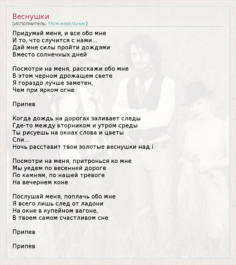 Придумай меня, и все обо мне И то, что случится с нами... Дай мне силы пройти дождями Вместо солнечных дней Посмотри на меня, расскажи обо мне В этом черном дрожащем свете Я гораздо лучше заметен, Чем при ярком огне Припев Когда дождь на дорогах заливает следы Где-то между вторником и утром среды Ты рисуешь на окнах слова и цветы Спи... Ночь расставит твои золотые веснушки над i Посмотри на меня, притронься ко мне Мы уедем по весенней дороге По камням, по нашей тревоге На вечернем коне Послушай меня, поплачь обо мне Я всего лишь след от ладони На окне в купейном вагоне, В твоем самом счастливом сне Припев Припев