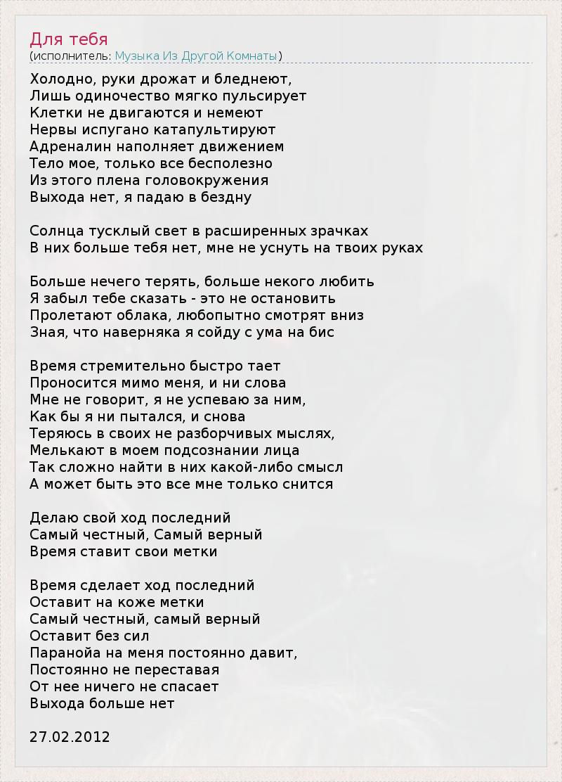 Улетали птицами гордыми минуты  Доставляет!(текст)  Tombe La Neige (с текстом песни)  Для танца(как резать - написано,  Скажи мне что такое любовь  KeshYou_Баллер  Так и скажи (wwwerger.ru) 2017  Мадам  La Inquietud... см. текст песни )  Cocaine (есть перевод текста)❤