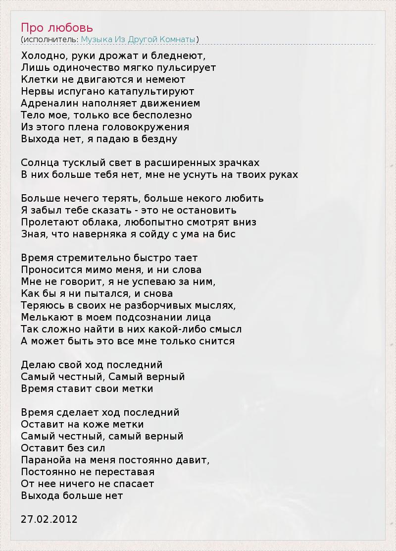 Это интересно:На стыке 2005-2006 в Иваново два давнишних друга Ильдар Авхадшин и Гоша Грушин, игравшие ранее в совместных проектах, решили снова играть вместе. Недолго думая, взяли в группу пару знакомых, желающих, но не очень умеющих играть и решили назвать команду "Музыка из другой комнаты".... продолжение