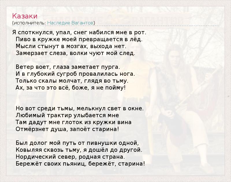 Я споткнулся, упал, снег набился мне в рот. Пиво в кружке моей превращается в лёд. Мысли стынут в мозгах, выхода нет. Замерзает слеза, волки чуют мой след. Ветер воет, глаза заметает пурга. И в глубокий сугроб провалилась нога. Только скалы молчат, глядя во тьму. Ах, за что это всё, боже, я не пойму! Но вот среди тьмы, мелькнул свет в окне. Любимый трактир улыбается мне Там дадут мне глоток из кружки вина Отмёрзнет душа, запоёт старина! Был долог мой путь от пивнушки одной, Ковыляя сквозь тьму, я дошёл до другой. Нордический север, родная страна. Бережёт своих пьяниц, бережёт, старина!
