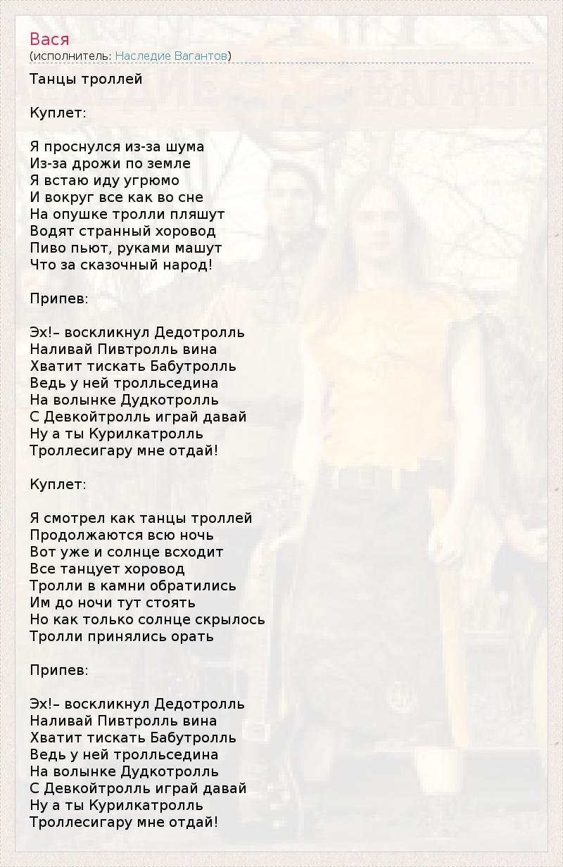 Танцы троллей Куплет: Я проснулся из-за шума Из-за дрожи по земле Я встаю иду угрюмо И вокруг все как во сне На опушке тролли пляшут Водят странный хоровод Пиво пьют, руками машут Что за сказочный народ! Припев: Эх!– воскликнул Дедотролль Наливай Пивтролль вина Хватит тискать Бабутролль Ведь у ней тролльседина На волынке Дудкотролль С Девкойтролль играй давай Ну а ты Курилкатролль Троллесигару мне отдай! Куплет: Я смотрел как танцы троллей Продолжаются всю ночь Вот уже и солнце всходит Все танцует хоровод Тролли в камни обратились Им до ночи тут стоять Но как только солнце скрылось Тролли принялись орать Припев: Эх!– воскликнул Дедотролль Наливай Пивтролль вина Хватит тискать Бабутролль Ведь у ней тролльседина На волынке Дудкотролль С Девкойтролль играй давай Ну а ты Курилкатролль Троллесигару мне отдай!