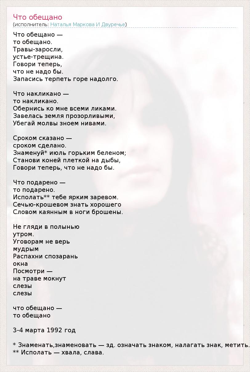 What promised - it promised. Grass, bushes, mouth-crack. Speak now that we should not be. Inventories endure grief for long. What is a self-fulfilling - is a self-fulfilling. Turn back to me all the faces. Bred earth visionary, Flee rumors heat nivami. The date mentioned - a term made. * July marks the bitter white-washed; Stanovi whip horses reared, Now says that we should not be. Given that the - is given. ** Ispolat you bright glow. Sich-medley know good Word kayannym thrown at his feet. Do not look into wormwood morning. Persuaded not believe wise Raspahni spozaran window Look - get wet on the grass tears tears that promised - it promised 3-4 March 1992 * Znamenat, signify - Bld. means a sign, to impose a sign labeled. ** Ispolat - praise, praise.