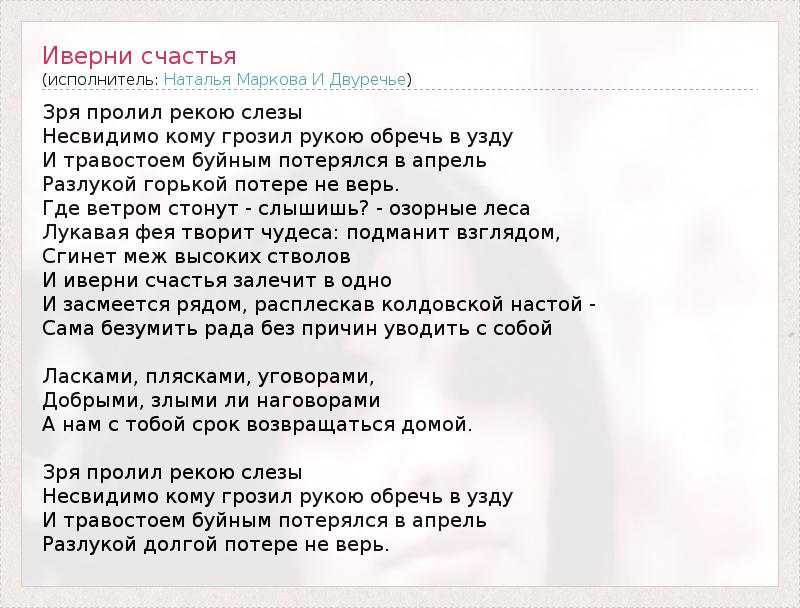 Зря пролил рекою слезы Несвидимо кому грозил рукою обречь в узду И травостоем буйным потерялся в апрель Разлукой горькой потере не верь. Где ветром стонут - слышишь? - озорные леса Лукавая фея творит чудеса: подманит взглядом, Сгинет меж высоких стволов И иверни счастья залечит в одно И засмеется рядом, расплескав колдовской настой - Сама безумить рада без причин уводить с собой Ласками, плясками, уговорами, Добрыми, злыми ли наговорами А нам с тобой срок возвращаться домой. Зря пролил рекою слезы Несвидимо кому грозил рукою обречь в узду И травостоем буйным потерялся в апрель Разлукой долгой потере не верь.