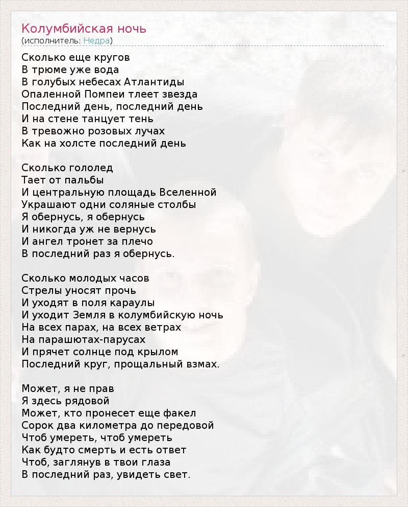 Сколько еще кругов В трюме уже вода В голубых небесах Атлантиды Опаленной Помпеи тлеет звезда Последний день, последний день И на стене танцует тень В тревожно розовых лучах Как на холсте последний день Сколько гололед Тает от пальбы И центральную площадь Вселенной Украшают одни соляные столбы Я обернусь, я обернусь И никогда уж не вернусь И ангел тронет за плечо В последний раз я обернусь. Сколько молодых часов Стрелы уносят прочь И уходят в поля караулы И уходит Земля в колумбийскую ночь На всех парах, на всех ветрах На парашютах-парусах И прячет солнце под крылом Последний круг, прощальный взмах. Может, я не прав Я здесь рядовой Может, кто пронесет еще факел Сорок два километра до передовой Чтоб умереть, чтоб умереть Как будто смерть и есть ответ Чтоб, заглянув в твои глаза В последний раз, увидеть свет.