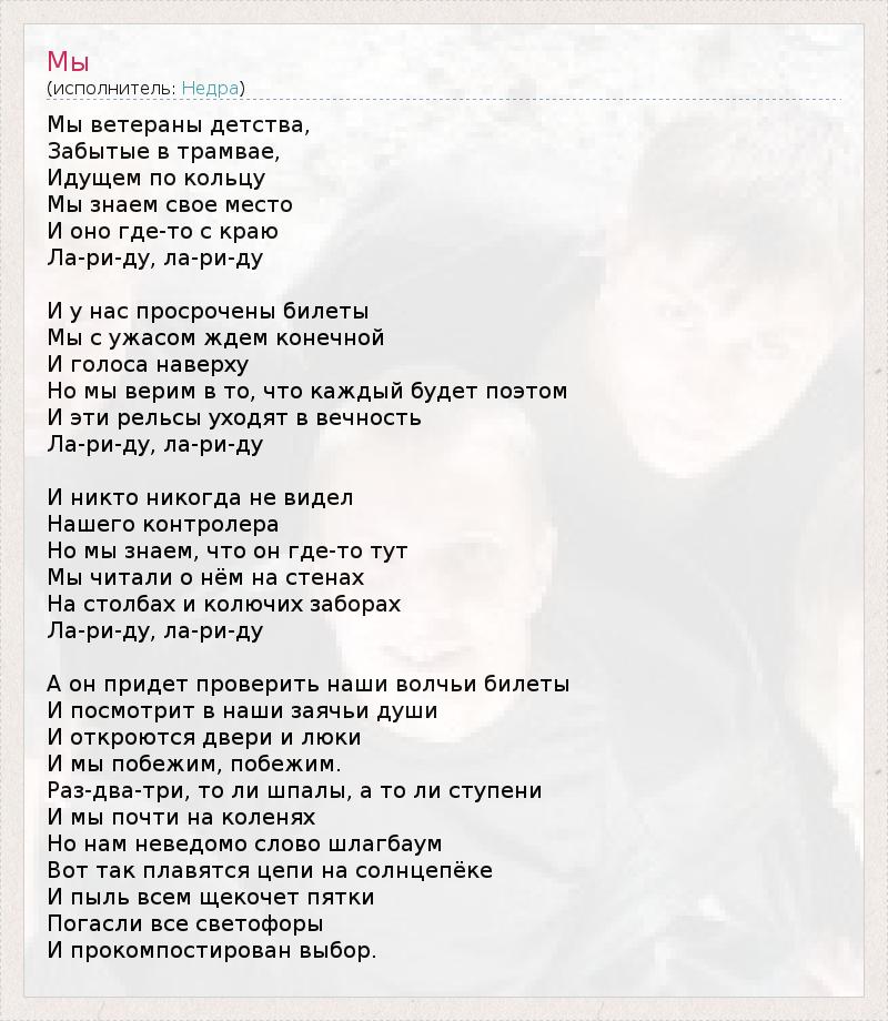 Это интересно:Группа "НедРа" появилась на свет в подмосковном городе Чехов на рубеже нового века на почве, обильно удобренной классиками русского рока. Восприняв от своих духовных учителей драйв, мелодизм, поэзию русского рок-н-ролла, НедРа смогли настолько сильно проявить собственные качества на этом поле, что теперь вполне могут считаться одними из ярчайших продолжателей... продолжение