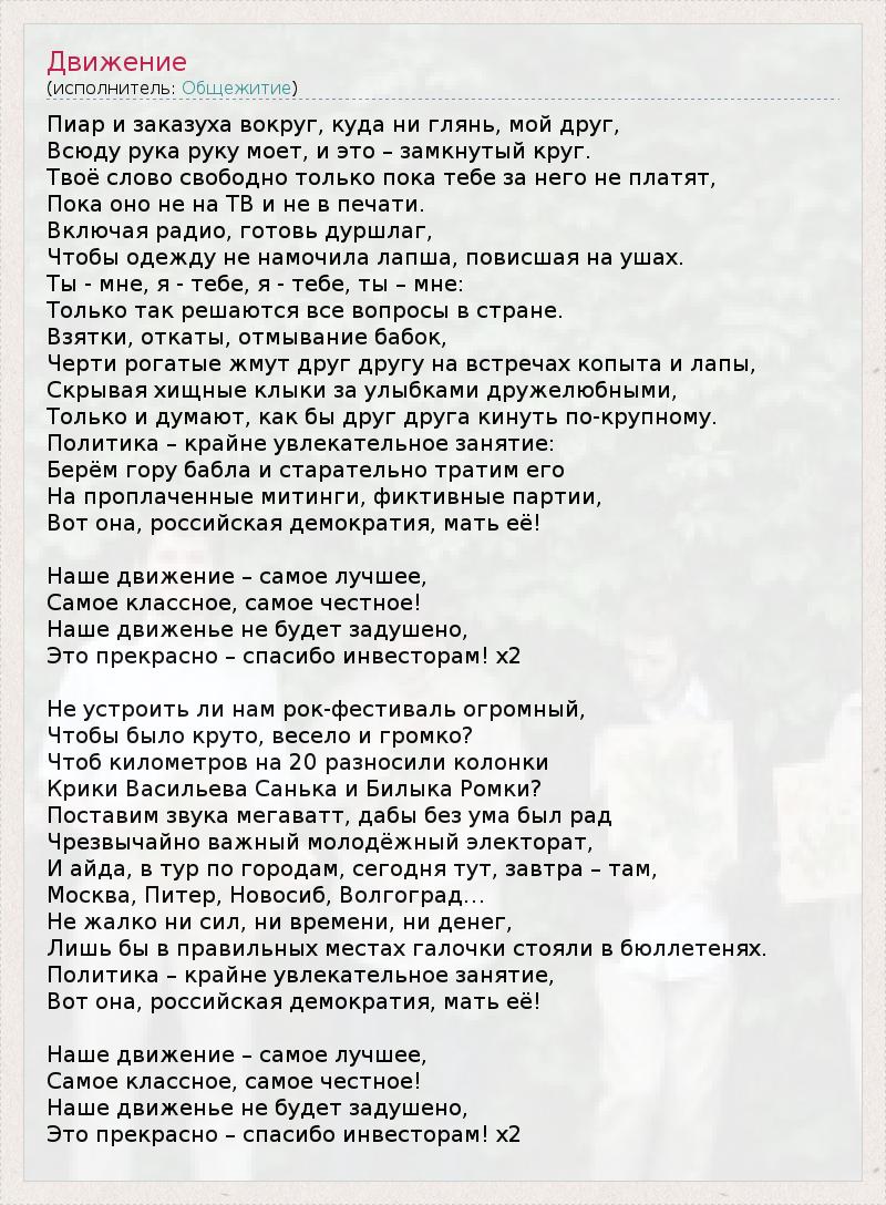 Пиар и заказуха вокруг, куда ни глянь, мой друг, Всюду рука руку моет, и это – замкнутый круг. Твоё слово свободно только пока тебе за него не платят, Пока оно не на ТВ и не в печати. Включая радио, готовь дуршлаг, Чтобы одежду не намочила лапша, повисшая на ушах. Ты - мне, я - тебе, я - тебе, ты – мне: Только так решаются все вопросы в стране. Взятки, откаты, отмывание бабок, Черти рогатые жмут друг другу на встречах копыта и лапы, Скрывая хищные клыки за улыбками дружелюбными, Только и думают, как бы друг друга кинуть по-крупному. Политика – крайне увлекательное занятие: Берём гору бабла и старательно тратим его На проплаченные митинги, фиктивные партии, Вот она, российская демократия, мать её! Наше движение – самое лучшее, Самое классное, самое честное! Наше движенье не будет задушено, Это прекрасно – спасибо инвесторам! х2 Не устроить ли нам рок-фестиваль огромный, Чтобы было круто, весело и громко? Чтоб километров на 20 разносили колонки Крики Васильева Санька и Билыка Ромки? Поставим звука мегаватт, дабы без ума был рад Чрезвычайно важный молодёжный электорат, И айда, в тур по городам, сегодня тут, завтра – там, Москва, Питер, Новосиб, Волгоград… Не жалко ни сил, ни времени, ни денег, Лишь бы в правильных местах галочки стояли в бюллетенях. Политика – крайне увлекательное занятие, Вот она, российская демократия, мать её! Наше движение – самое лучшее, Самое классное, самое честное! Наше движенье не будет задушено, Это прекрасно – спасибо инвесторам! х2