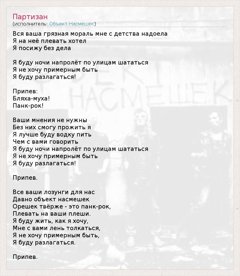 Вся ваша грязная мораль мне с детства надоела Я на неё плевать хотел Я посижу без дела Я буду ночи напролёт по улицам шататься Я не хочу примерным быть Я буду разлагаться! Припев: Бляха-муха! Панк-рок! Ваши мнения не нужны Без них смогу прожить я Я лучше буду водку пить Чем с вами говорить Я буду ночи напролёт по улицам шататься Я не хочу примерным быть Я буду разлагаться! Припев. Все ваши лозунги для нас Давно объект насмешек Орешек твёрже - это панк-рок, Плевать на ваши плеши. Я буду жить, как я хочу, Мне с вами лень толкаться, Я не хочу примерным быть, Я буду разлагаться. Припев.